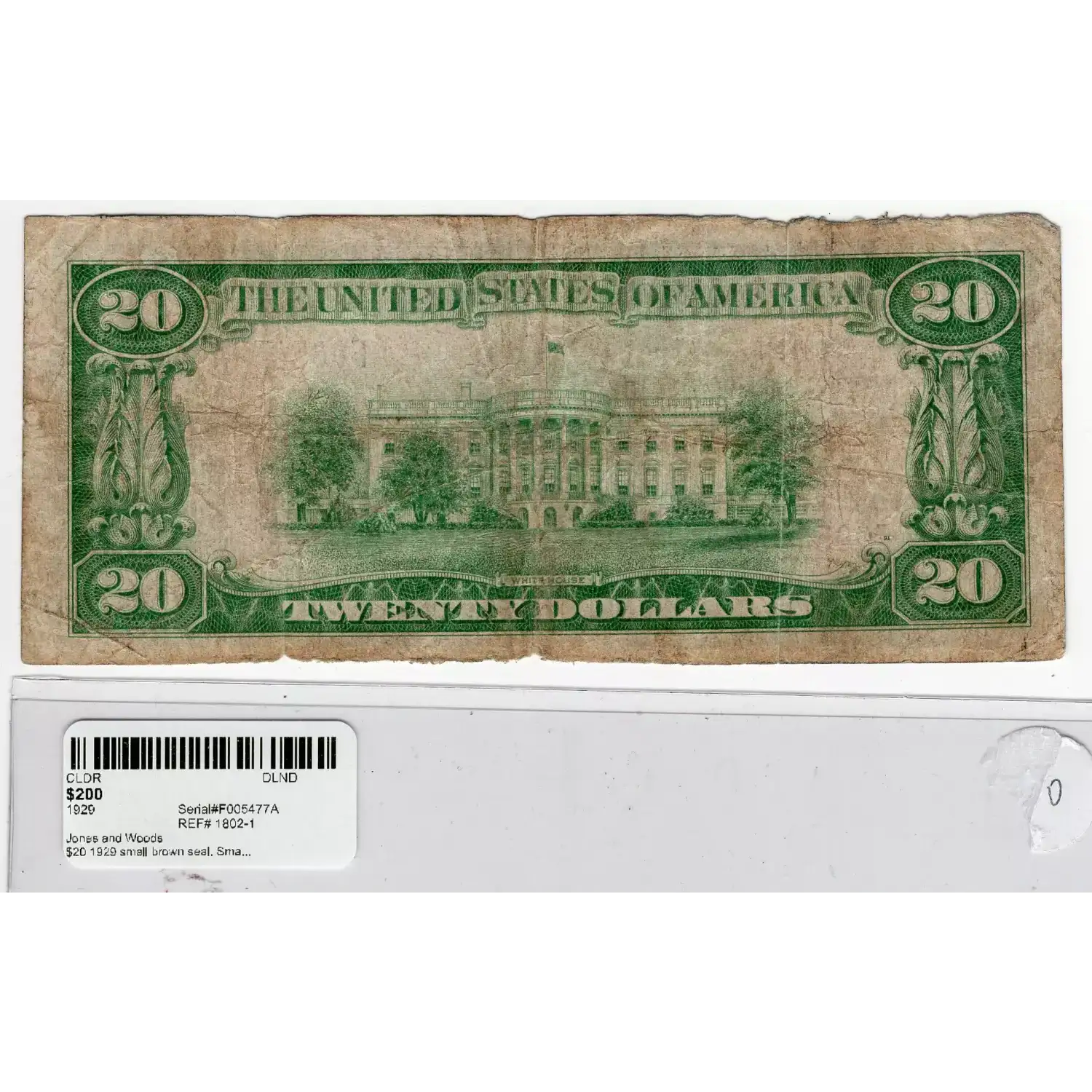 $20 1929 small brown seal. Small National Bank Notes 1802-1