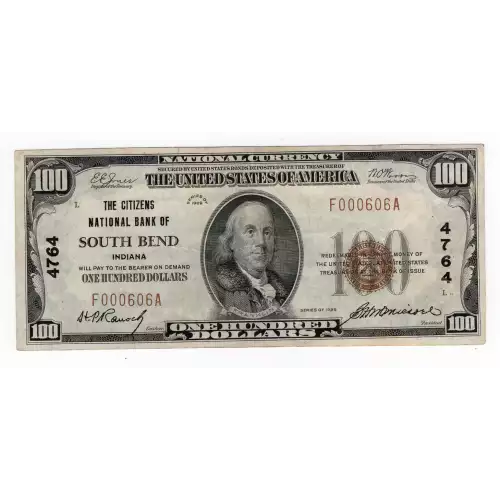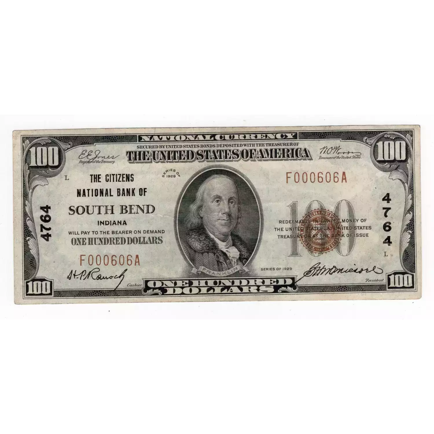 1929 Type I $100 The Citizens National Bank of South Bend Indiana Ch. 4764