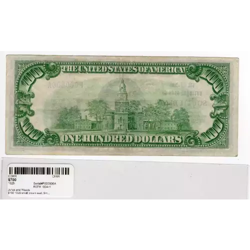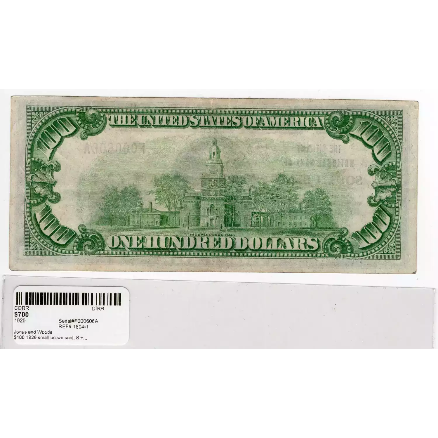 $100 1929 small brown seal. Small National Bank Notes 1804-1