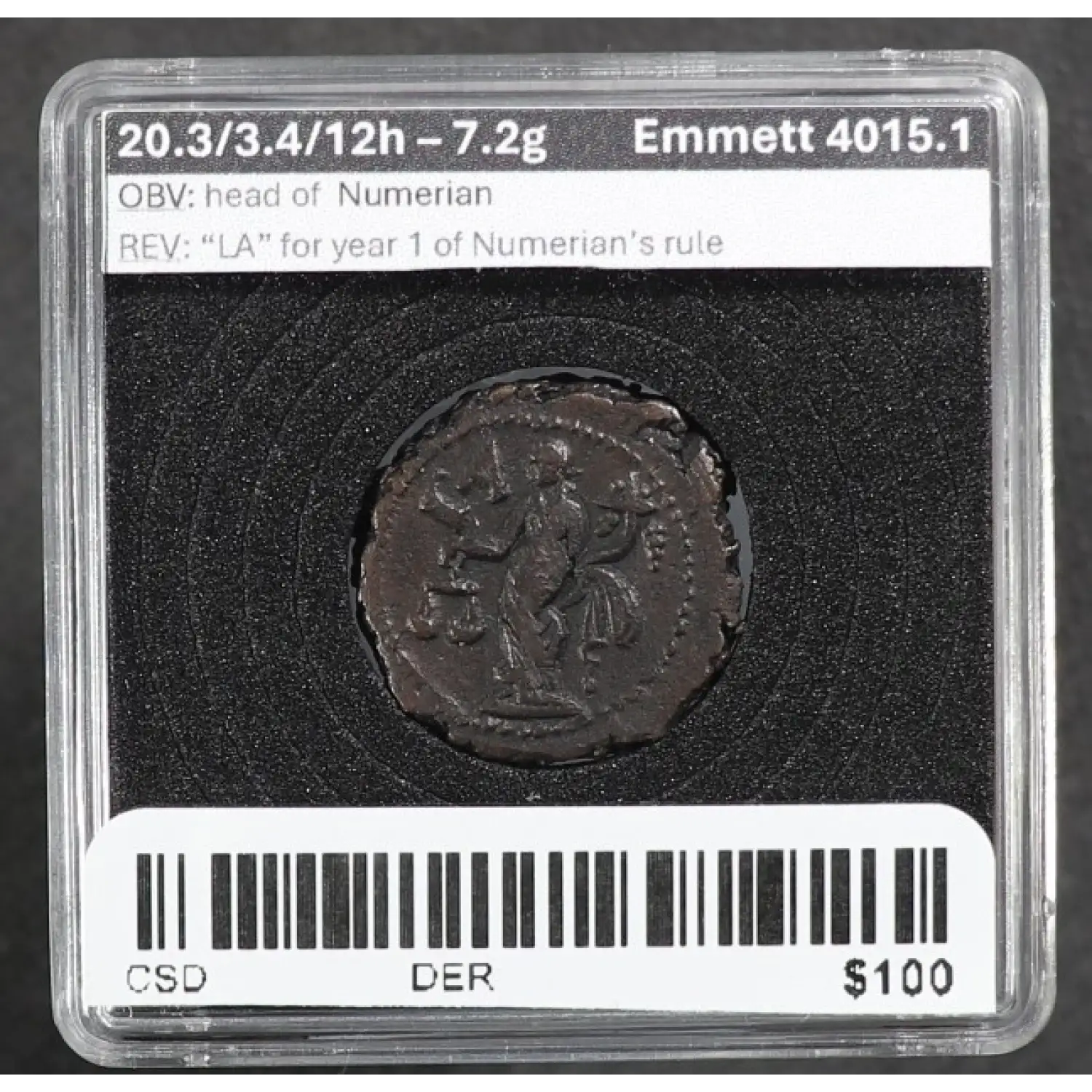 Numerian as Caesar AE Tetradrachm Alexandria 282-3 AD Dikaiosyne rx. w ScalesCoin is in an unsealed "quadrum" case for display purposes, as the coin is thicker the casing is held shut with small archival safe magnetsour inventory sticker with the barcode is an easy peel sticker that leaves no mess behind