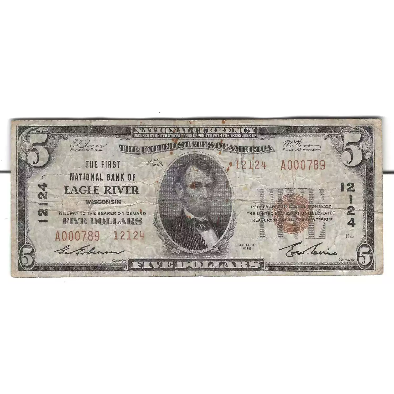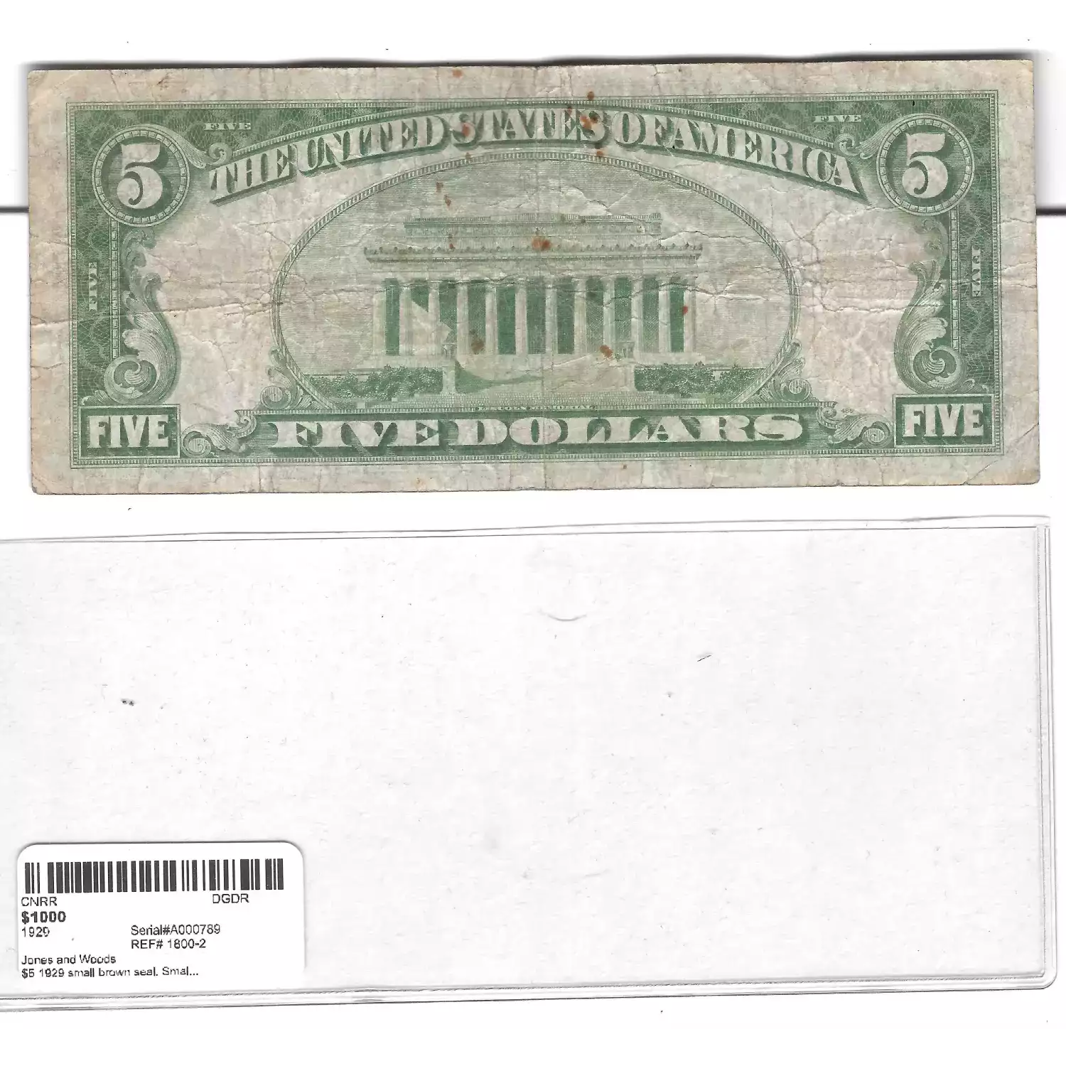 $5 1929 small brown seal. Small National Bank Notes 1800-2