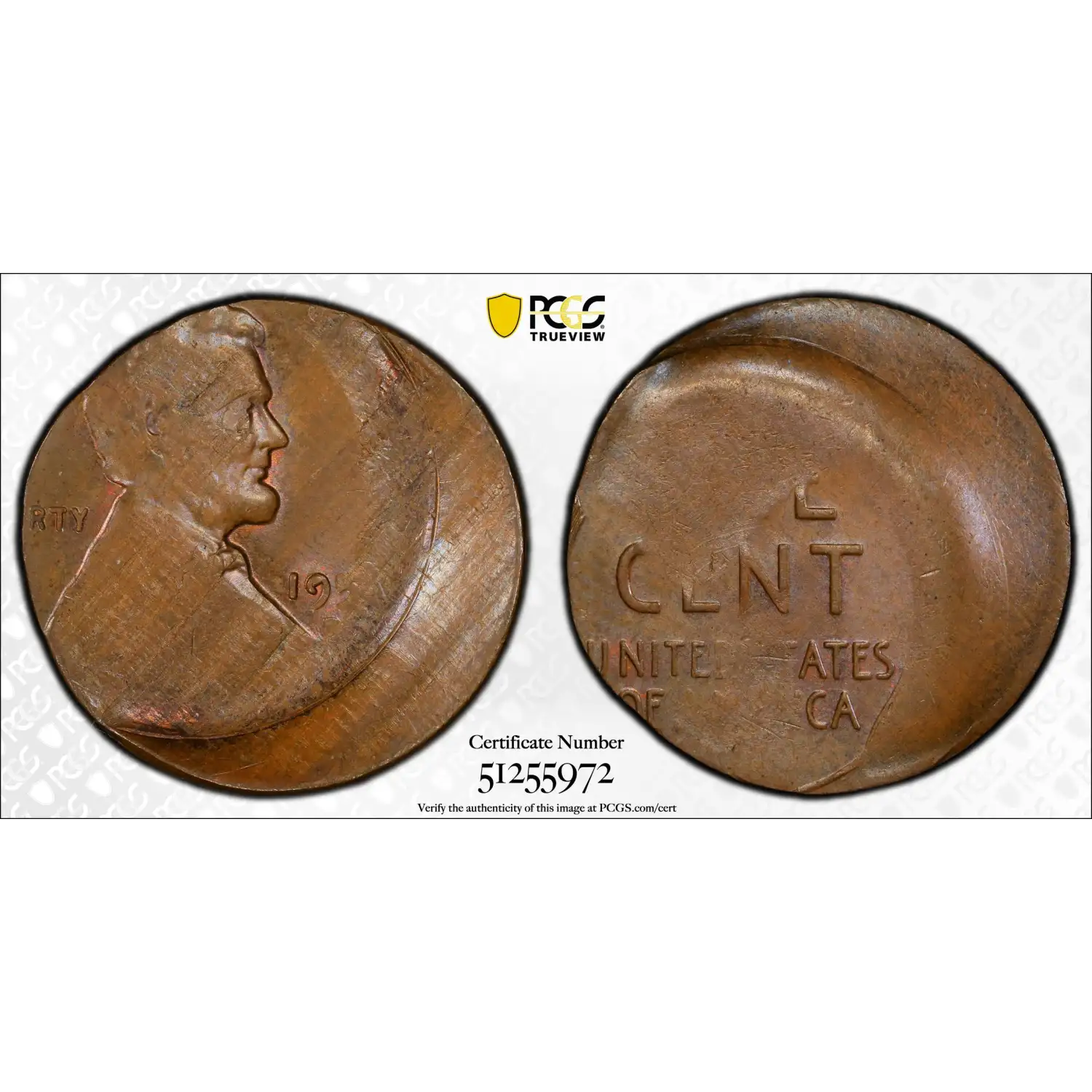 195X-D Small Cents Lincoln, Wheat Ears Reverse PCGS MS-62 BN Struck 25% Off Center On Split Planchet