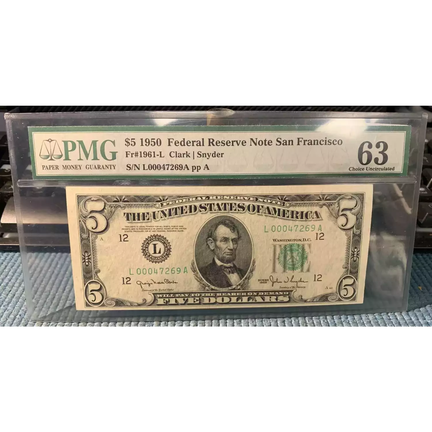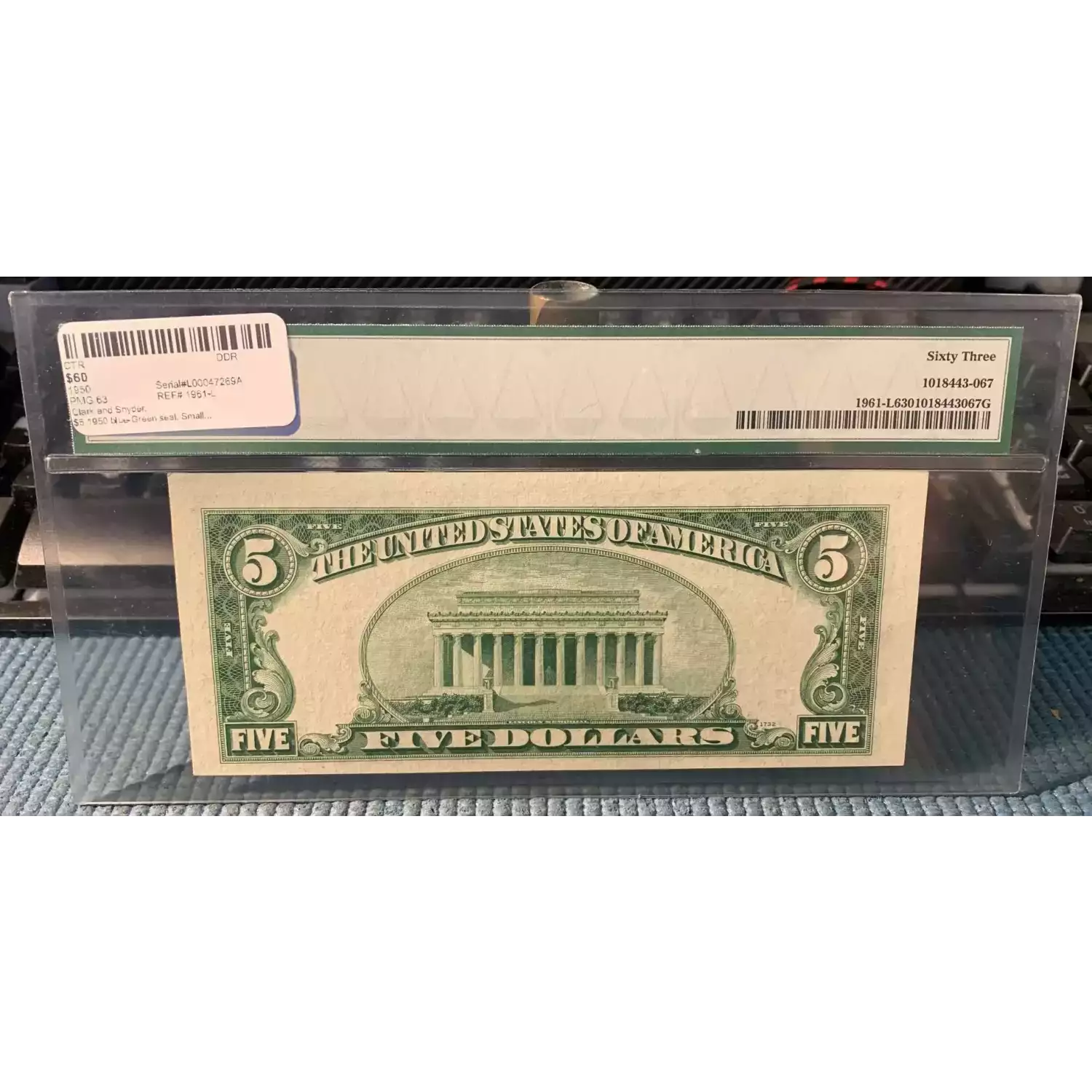 $5 1950 blue-Green seal. Small Size $5 Federal Reserve Notes 1961-L