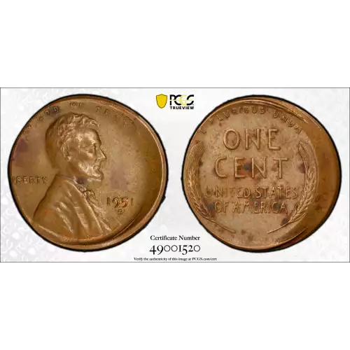1951-S Small Cents Lincoln, Wheat Ears Reverse PCGS MS-62 Struck 5% Off Center BN