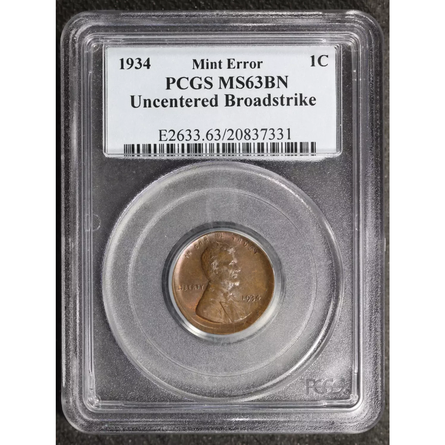 1934 Small Cents Lincoln, Wheat Ears Reverse PCGS MS-63 Uncentered Broadstrike BN