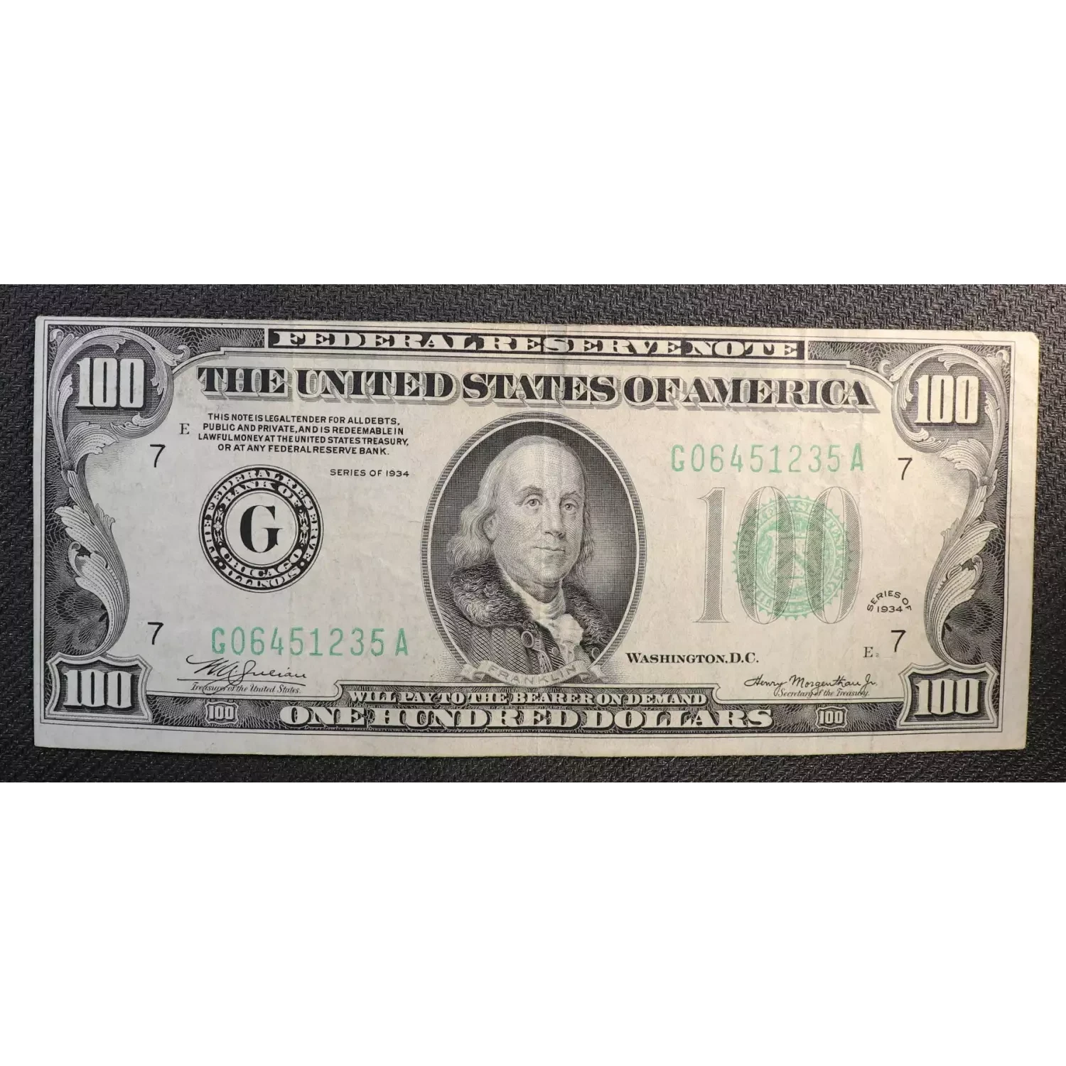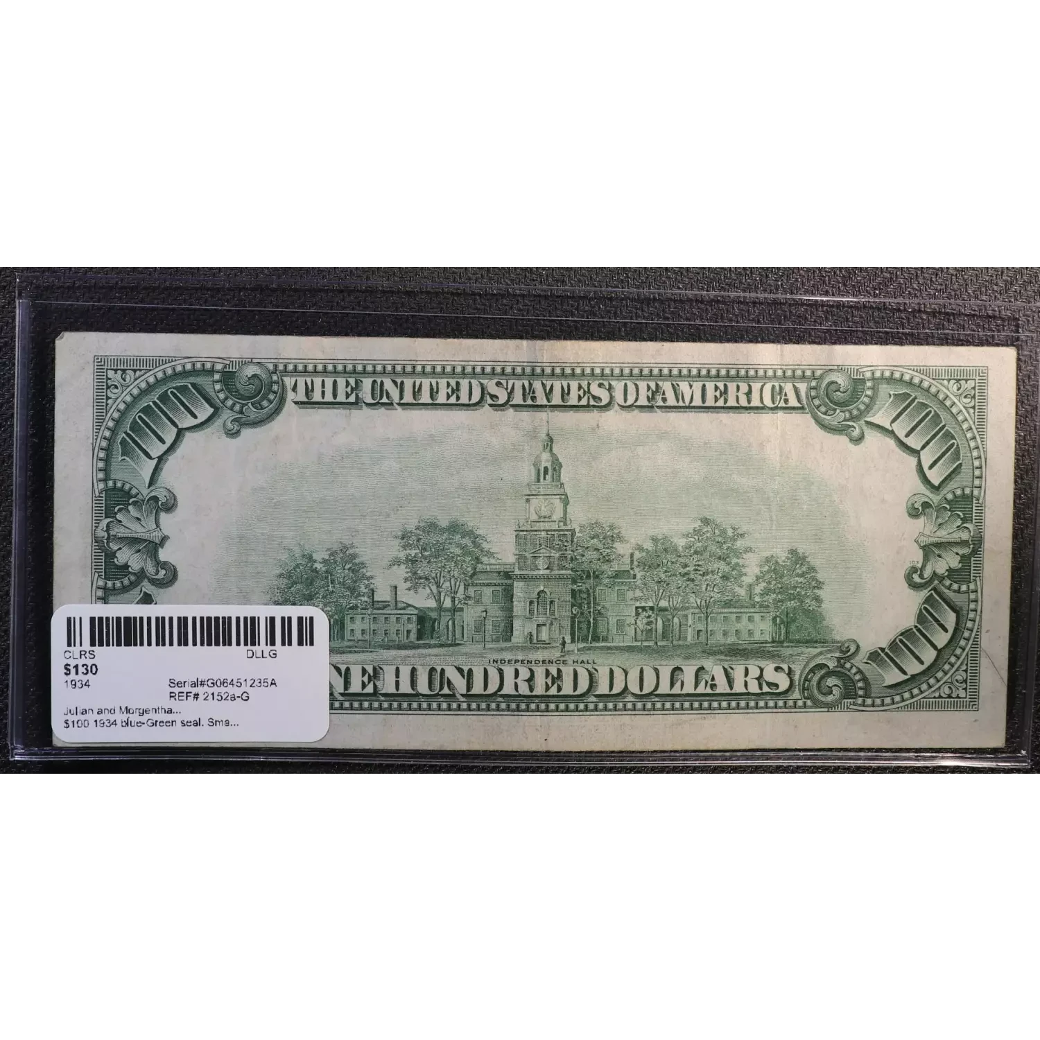 $100 1934 blue-Green seal. Small Size $100 Federal Reserve Notes 2152a-G