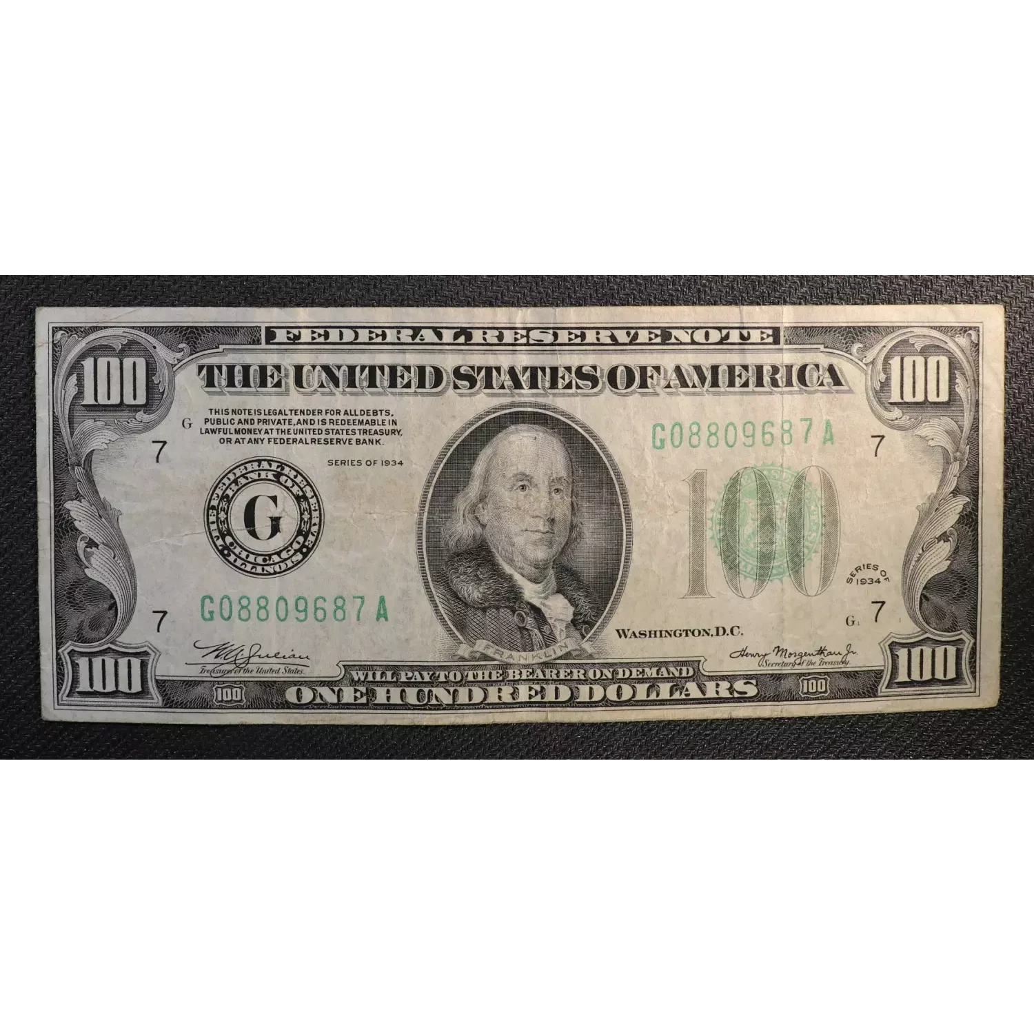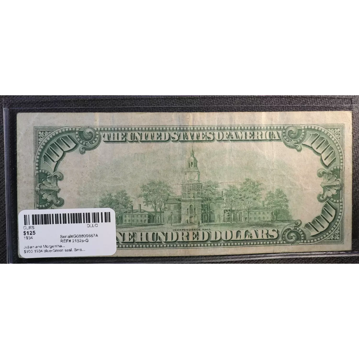 $100 1934 blue-Green seal. Small Size $100 Federal Reserve Notes 2152a-G