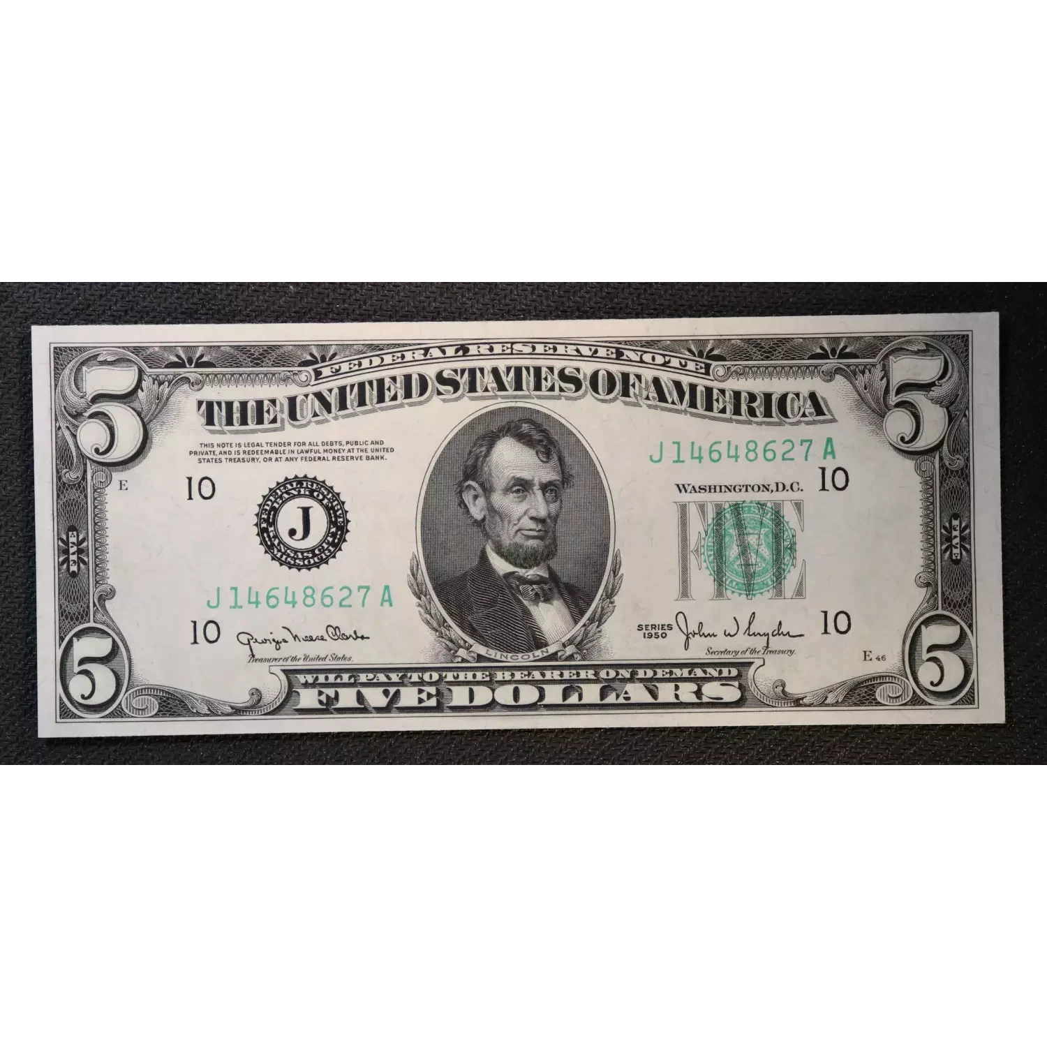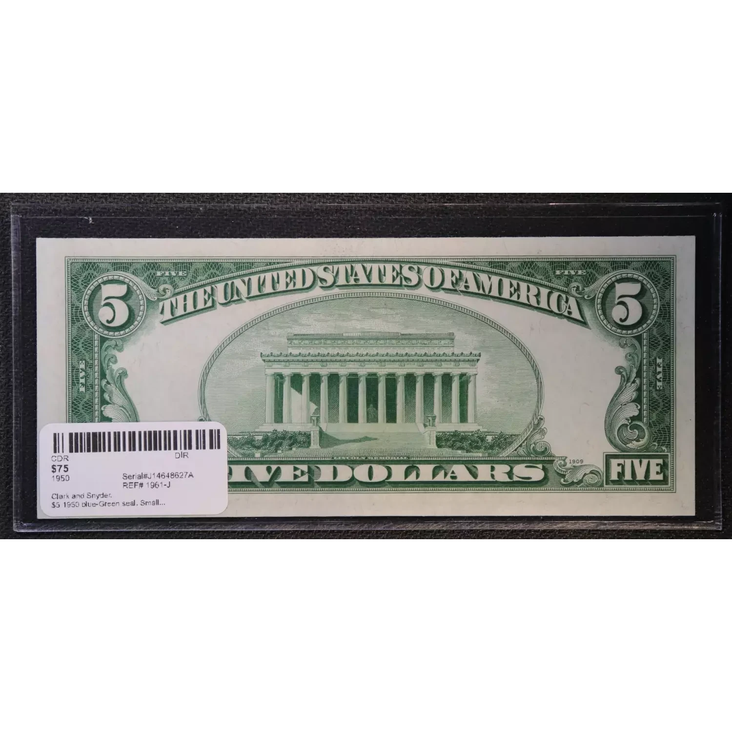 $5 1950 blue-Green seal. Small Size $5 Federal Reserve Notes 1961-J