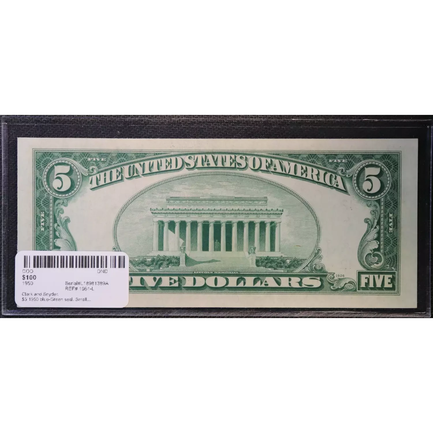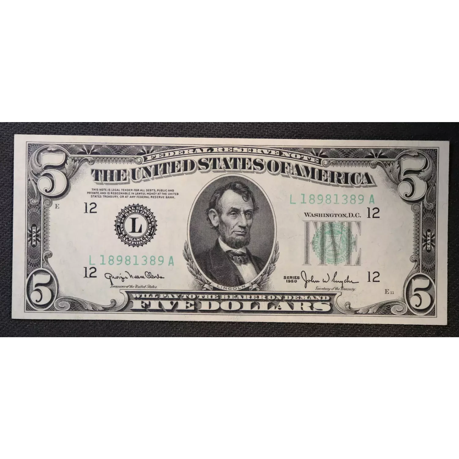 $5 1950 blue-Green seal. Small Size $5 Federal Reserve Notes 1961-L