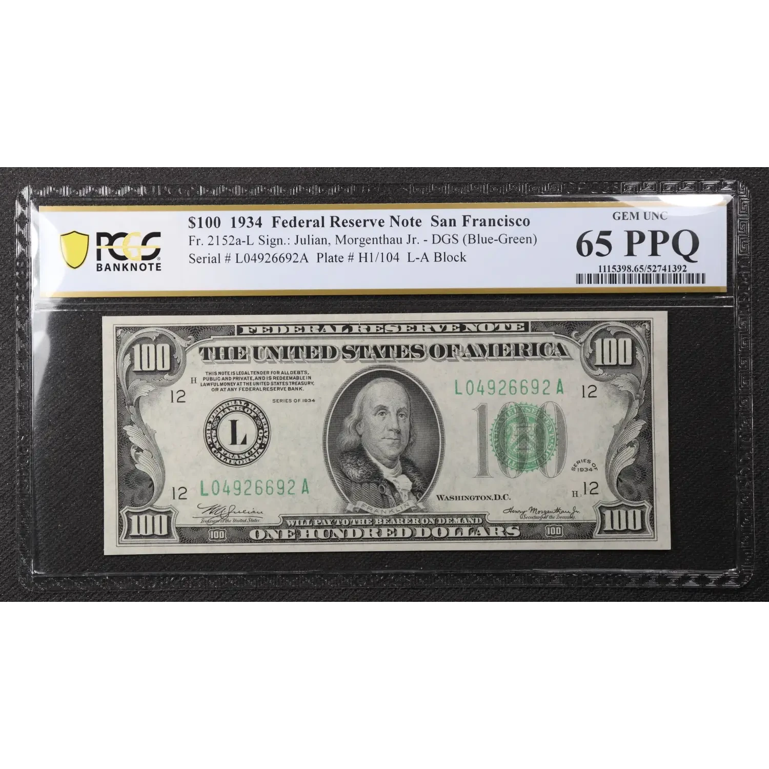 $100 1934 blue-Green seal. Small Size $100 Federal Reserve Notes 2152a-L
