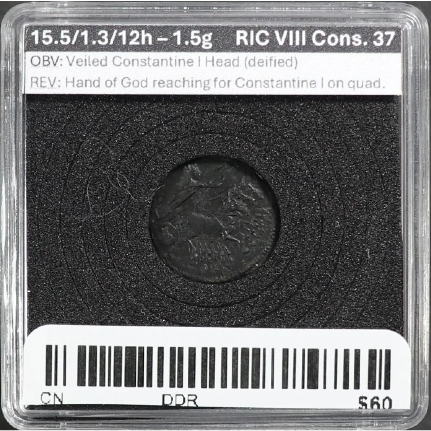 Deified Constantine I Follis 337-40 AD Constantinople Hand of God reverse!Coin is in an unsealed "quadrum" case for display purposes, simply insert a thumbnail into the bottom left corner and pull apartour inventory sticker with the barcode is an easy peel sticker that leaves no mess behind