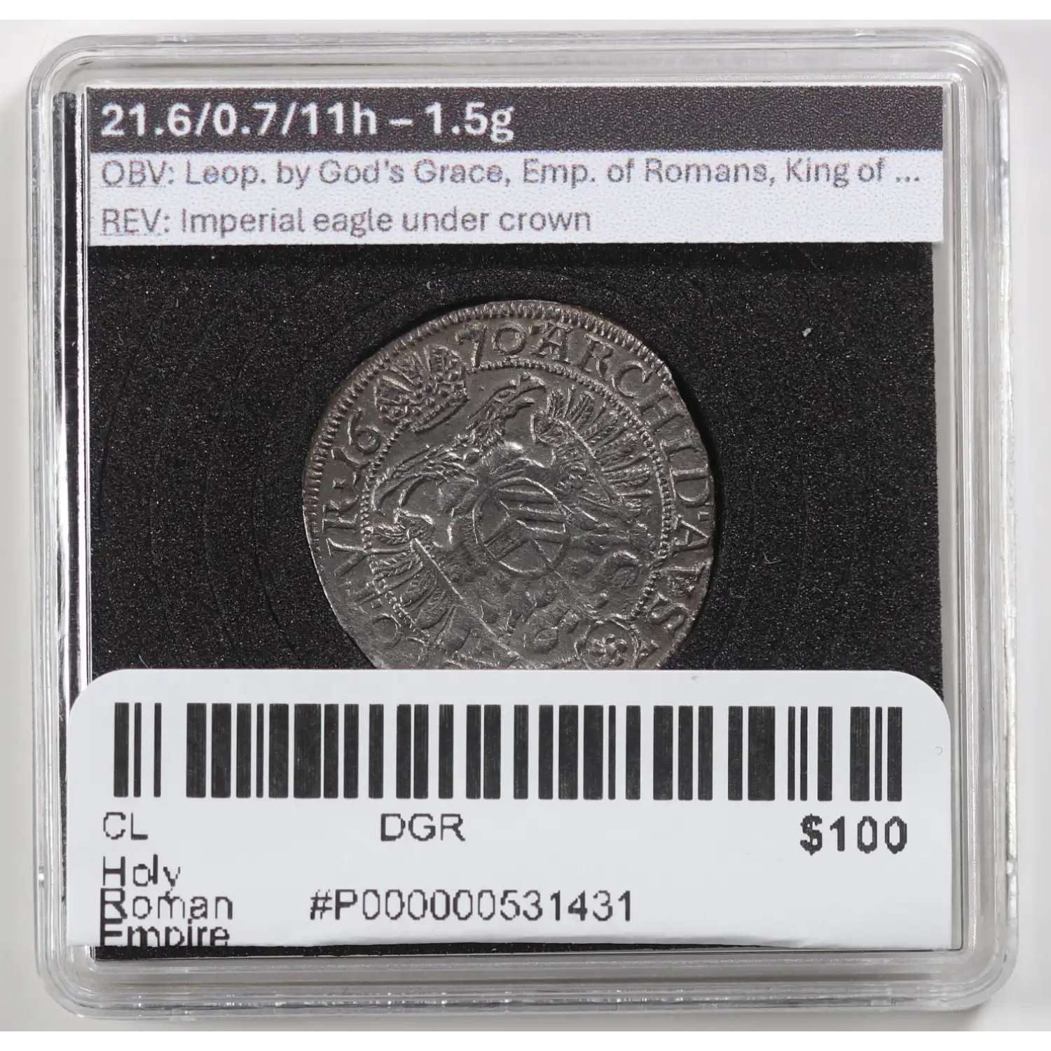 Holy Roman Empire Leopold I 'hogmouth' 3 Kreuzer 1670Coin is in an unsealed "quadrum" case for display purposes, simply insert a thumbnail into the bottom right corner and pull apartour inventory sticker with the barcode is an easy peel sticker that leaves no mess behind