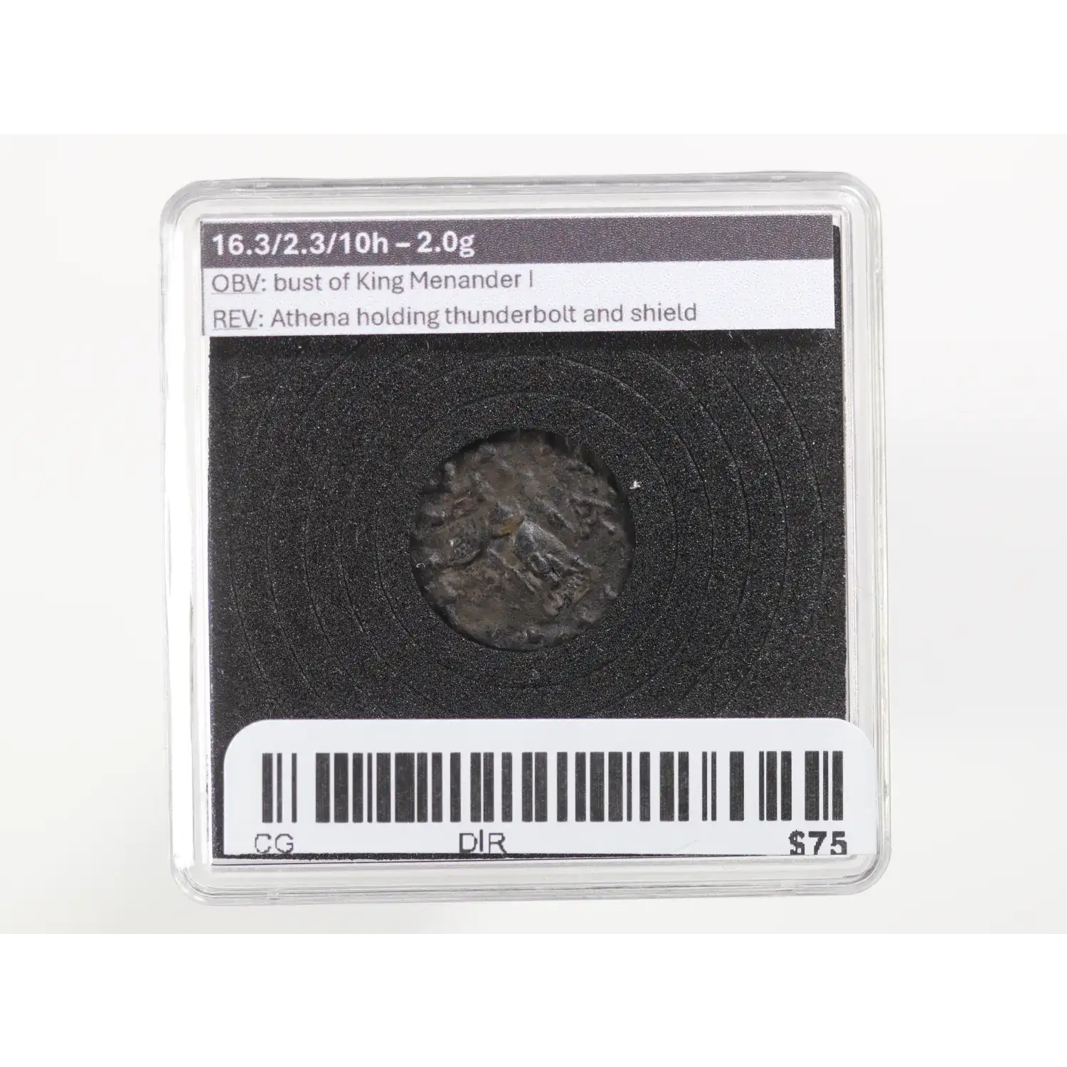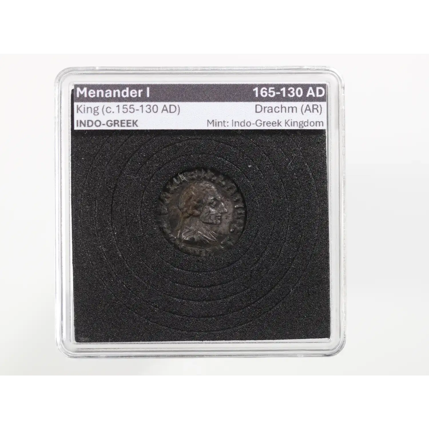 Indo-GreekIndo-Greek Menander I Silver Drachm 165-130 BC Great portraitCoin is in an unsealed "quadrum" case for display purposes, simply insert a thumbnail into the recessed corner and pull apartour inventory sticker with the barcode is an easy peel sticker that leaves no mess behind
