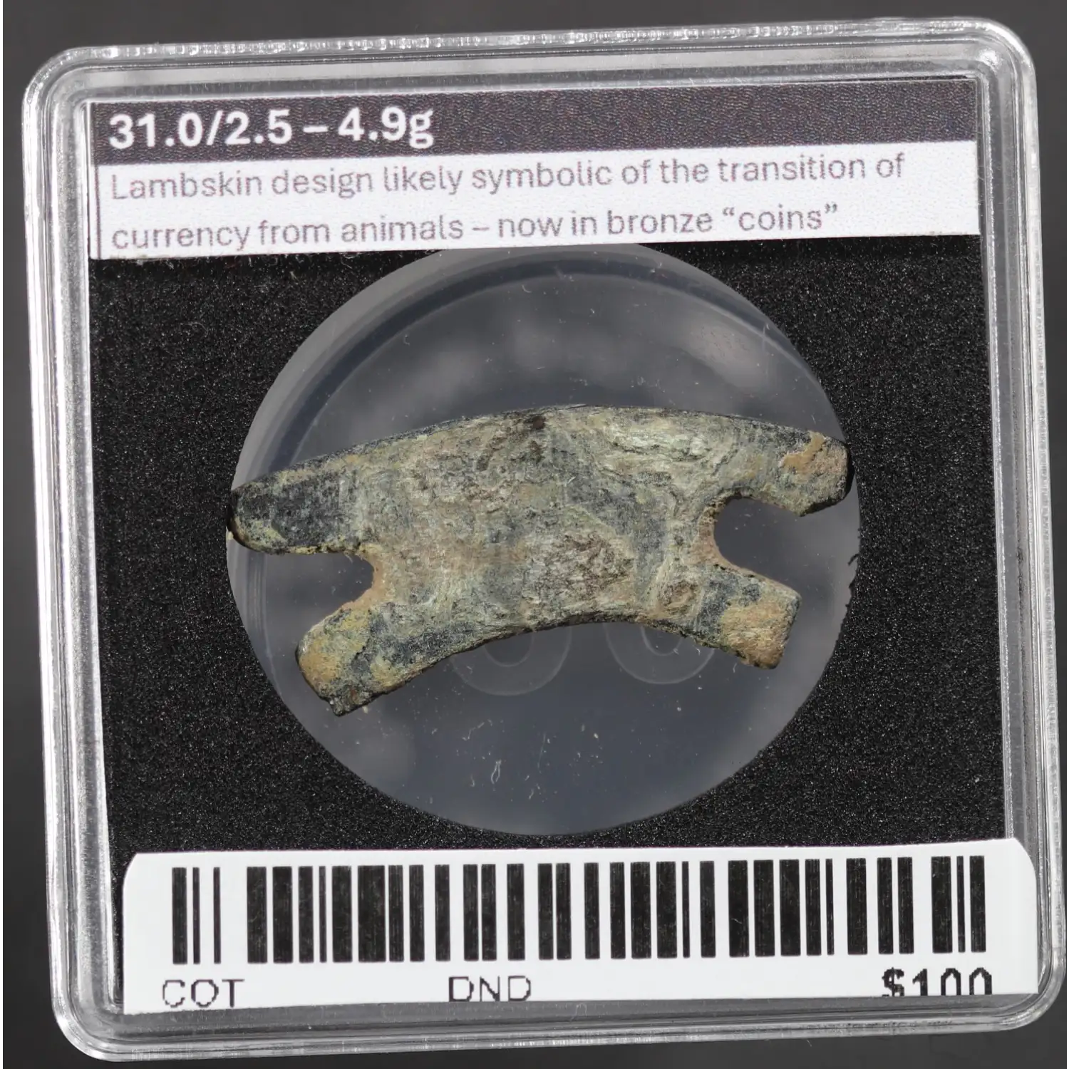 Ancient Central Italy AES Formatum Protocoin 600-200 BC Lambskin shapeWeight: 4.9gCoin is in an unsealed "quadrum" case for display purposes, simply insert a thumbnail into the bottom right corner and pull apartour inventory sticker with the barcode is an easy peel sticker that leaves no mess behind