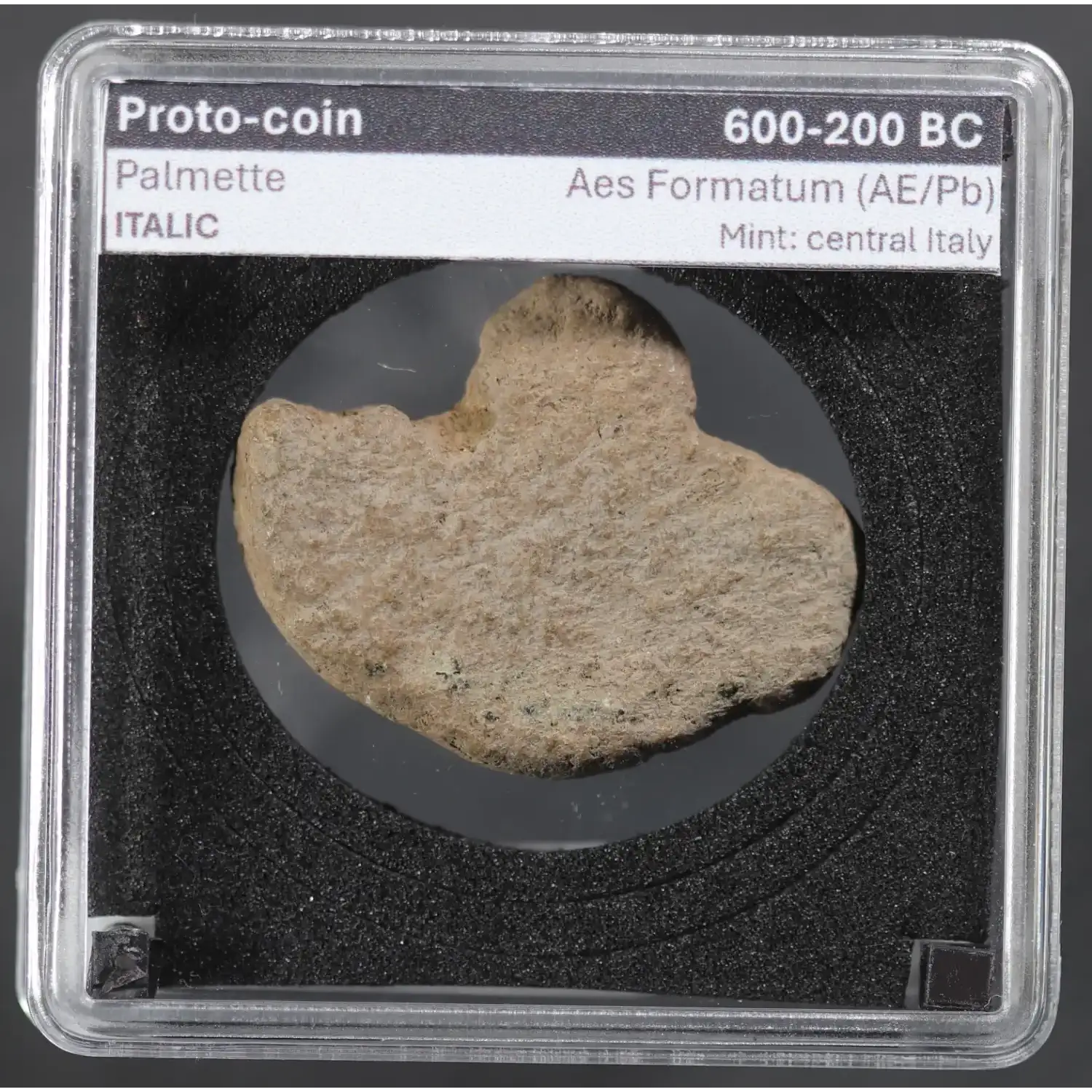 Ancient Central Italy AES Formatum Protocoin 600-200 BC Palmette shapeWeight: 16.1gCoin is in an unsealed "quadrum" case for display purposes, simply insert a thumbnail into the bottom right corner and pull apart, this one is held together with small archival safe magnets as this is a thicker item than what would fit in the caseour inventory sticker with the barcode is an easy peel sticker that leaves no mess behind