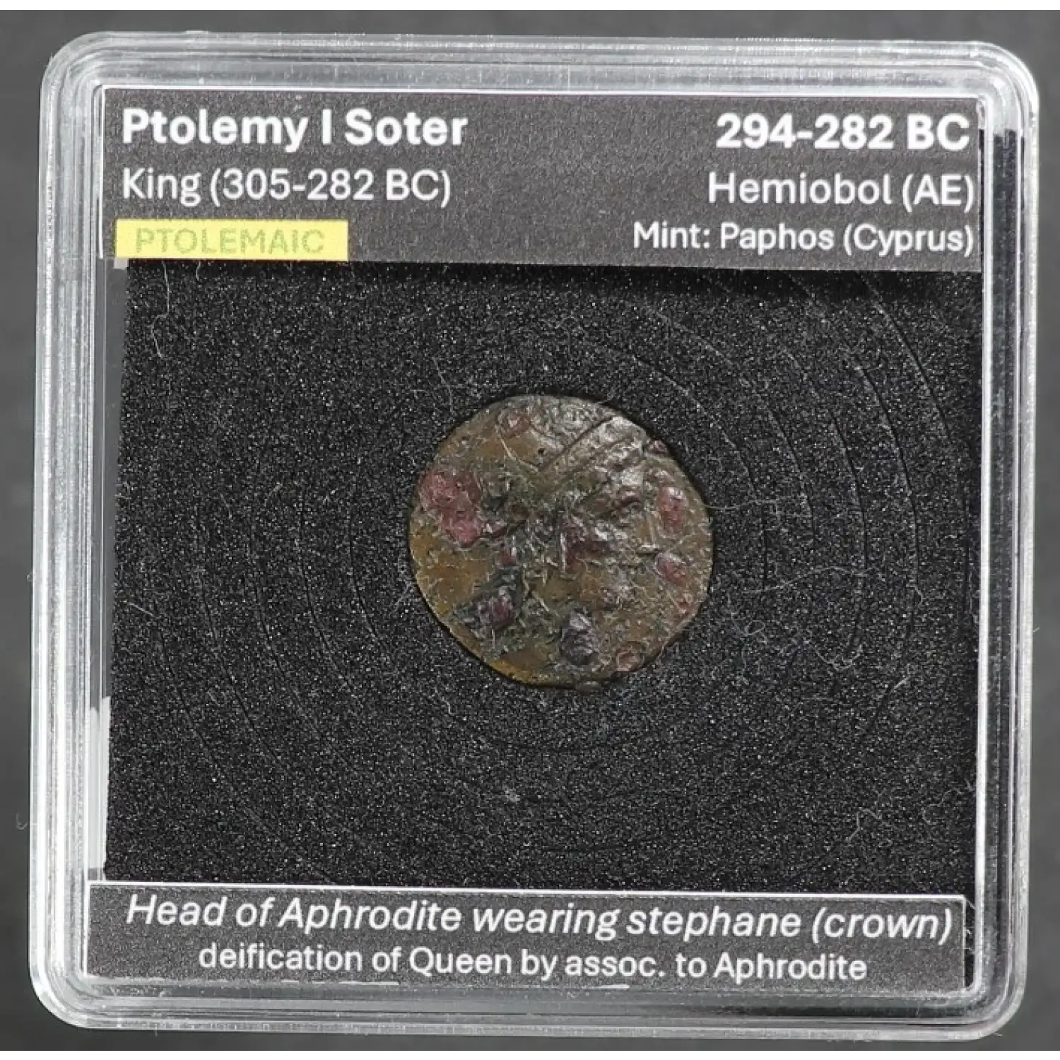 Ptolemaic Ptolemy I Soter AE Hemiobol 294-282 BC Paphos mint Aphrodite SCARCECoin is in an unsealed "quadrum" holder for display purposes, insert a thumbnail in bottom left corner to pull apart