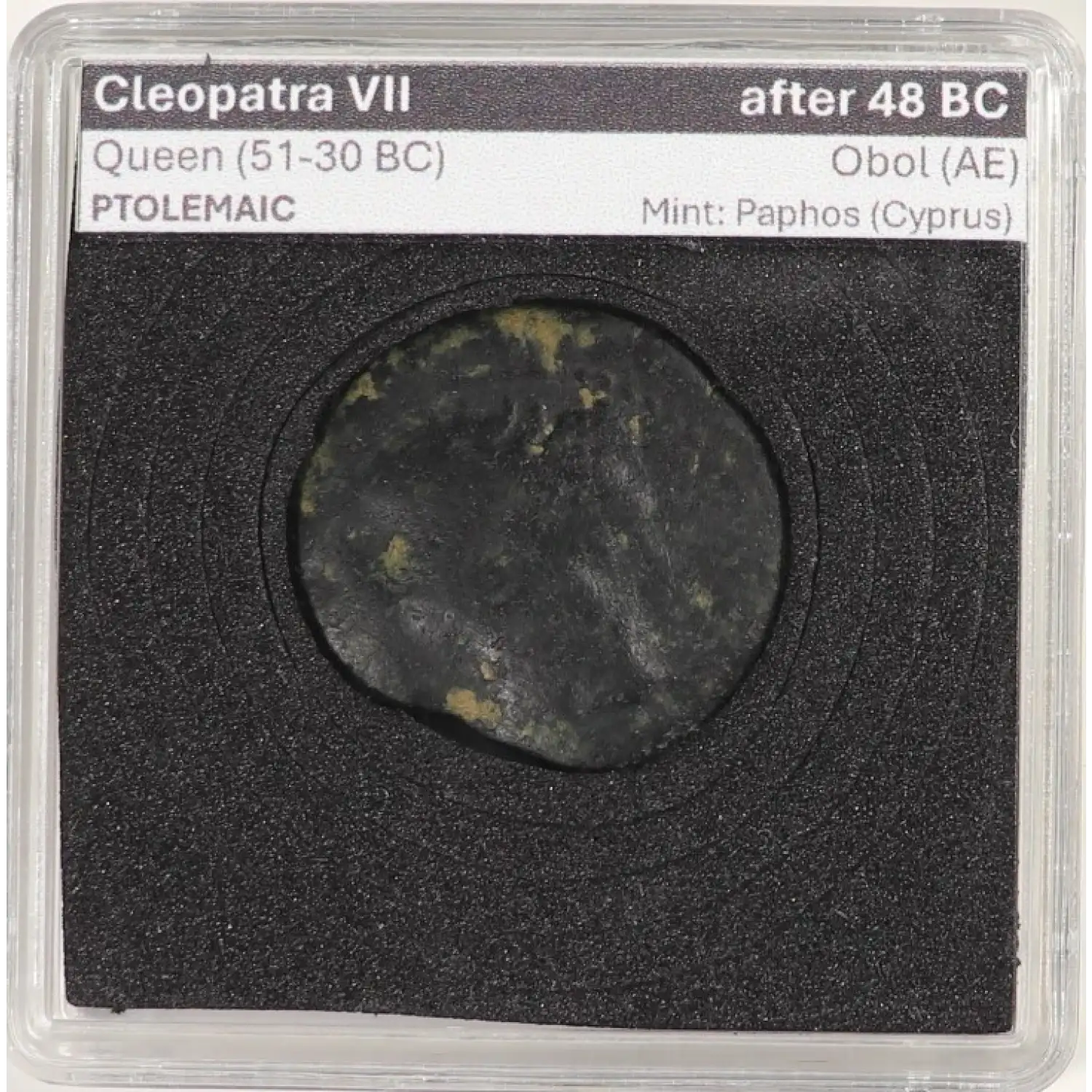 Ptolemaic Cleopatra VIII (the famous one) AE Obol after 48 BC Paphos mintCoin is in an unsealed "quadrum" holder for display purposes, insert a thumbnail in bottom left corner to pull apart