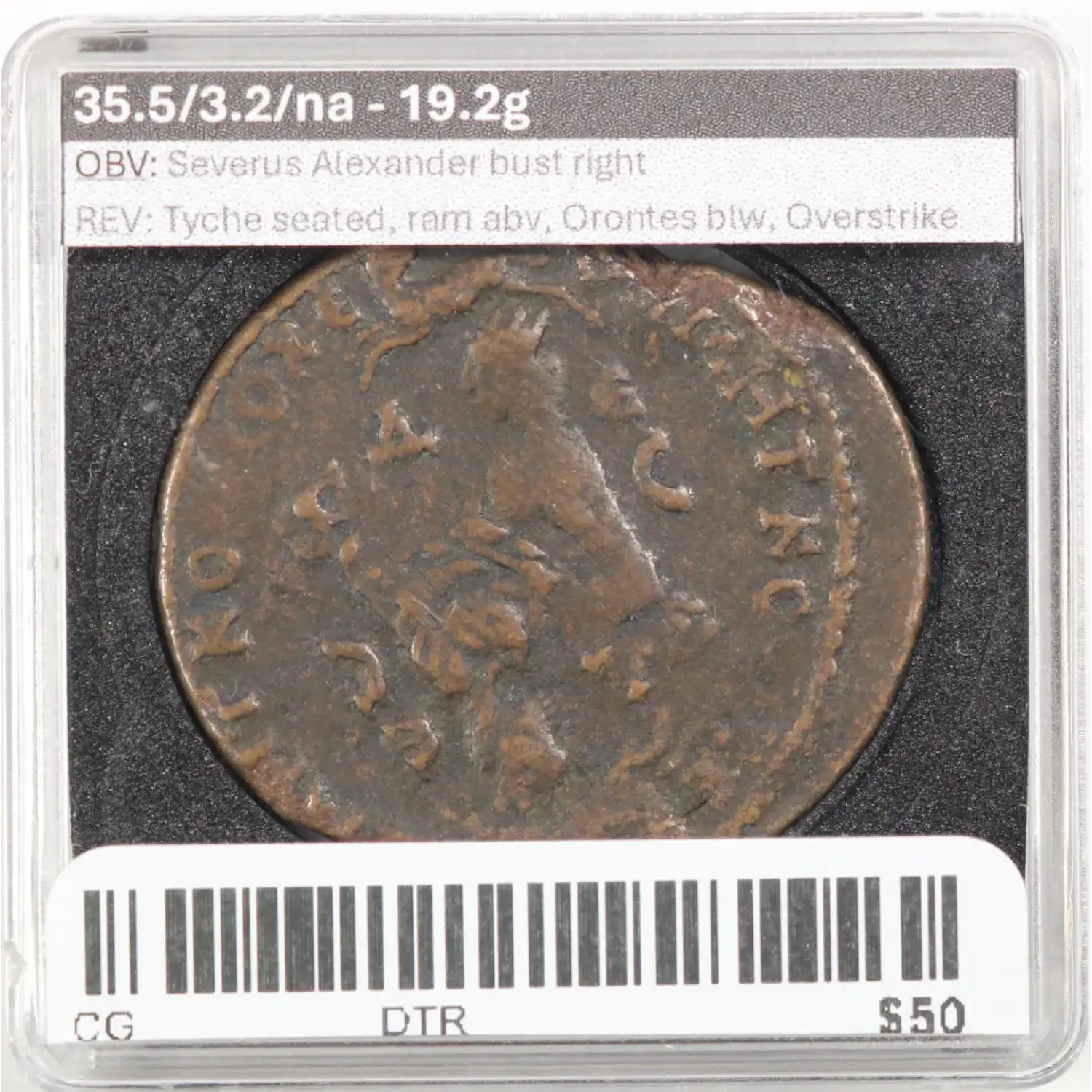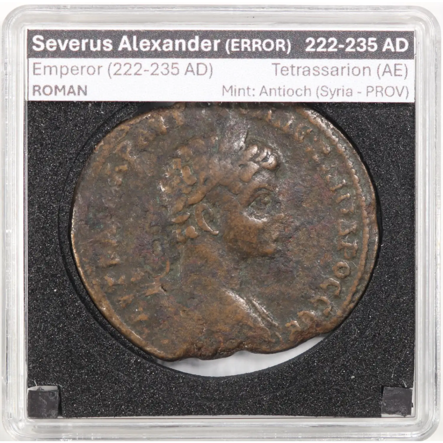 Provincial Antioch Severus Alexander AE Tetrassarion rotated overstrike errorCoin is in an unsealed "quadrum" holder for display purposes, as the coin is too thick for the holder to snap together, it is held closed by small archival safe magnets