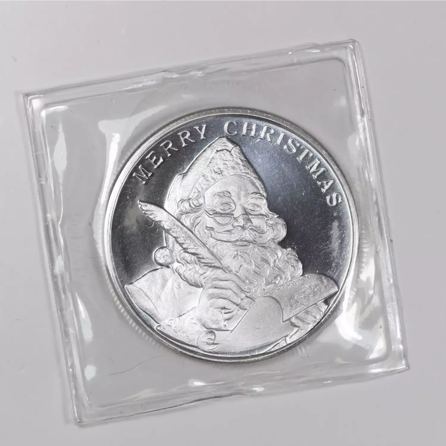 The obverse of this round features a Santa Claus Checking His List to find out who is naughty and who is nice. The words "MERRY CHRISTMAS" appear on the top part of the design.
