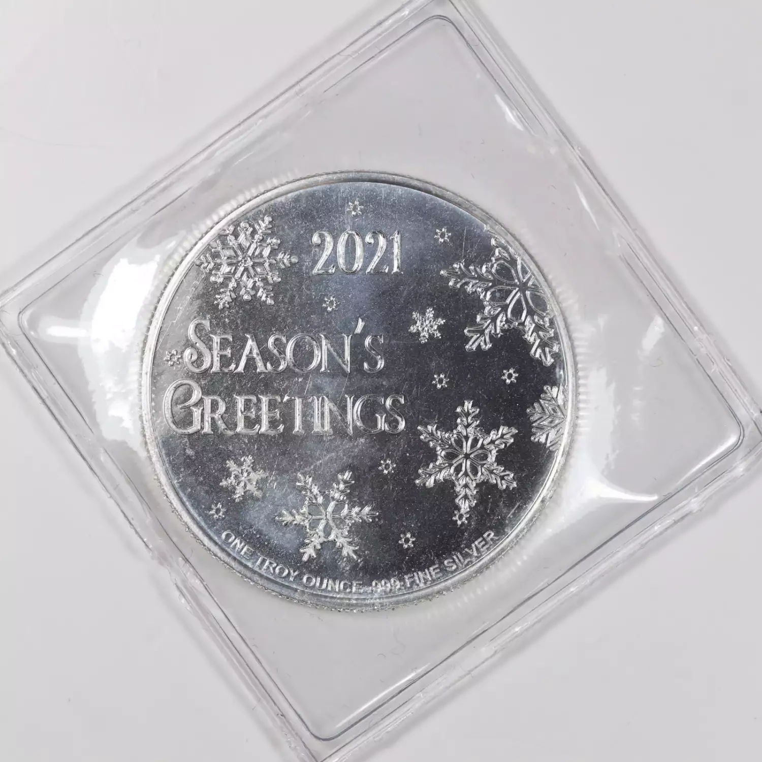 The reverse features our standard Season's Greetings back dated "2021" along with the weight and purity designation of "ONE TROY OUNCE .999 FINE SILVER". The Design Features a Snowflake scene.