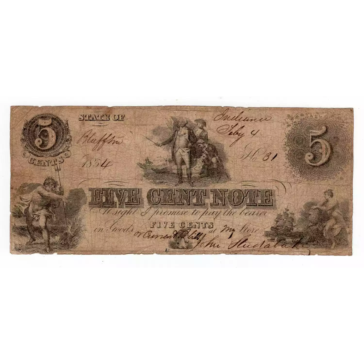 1854-Bluffton, IN 5¢ Note Studebaker signature Large Sized US Paper Money