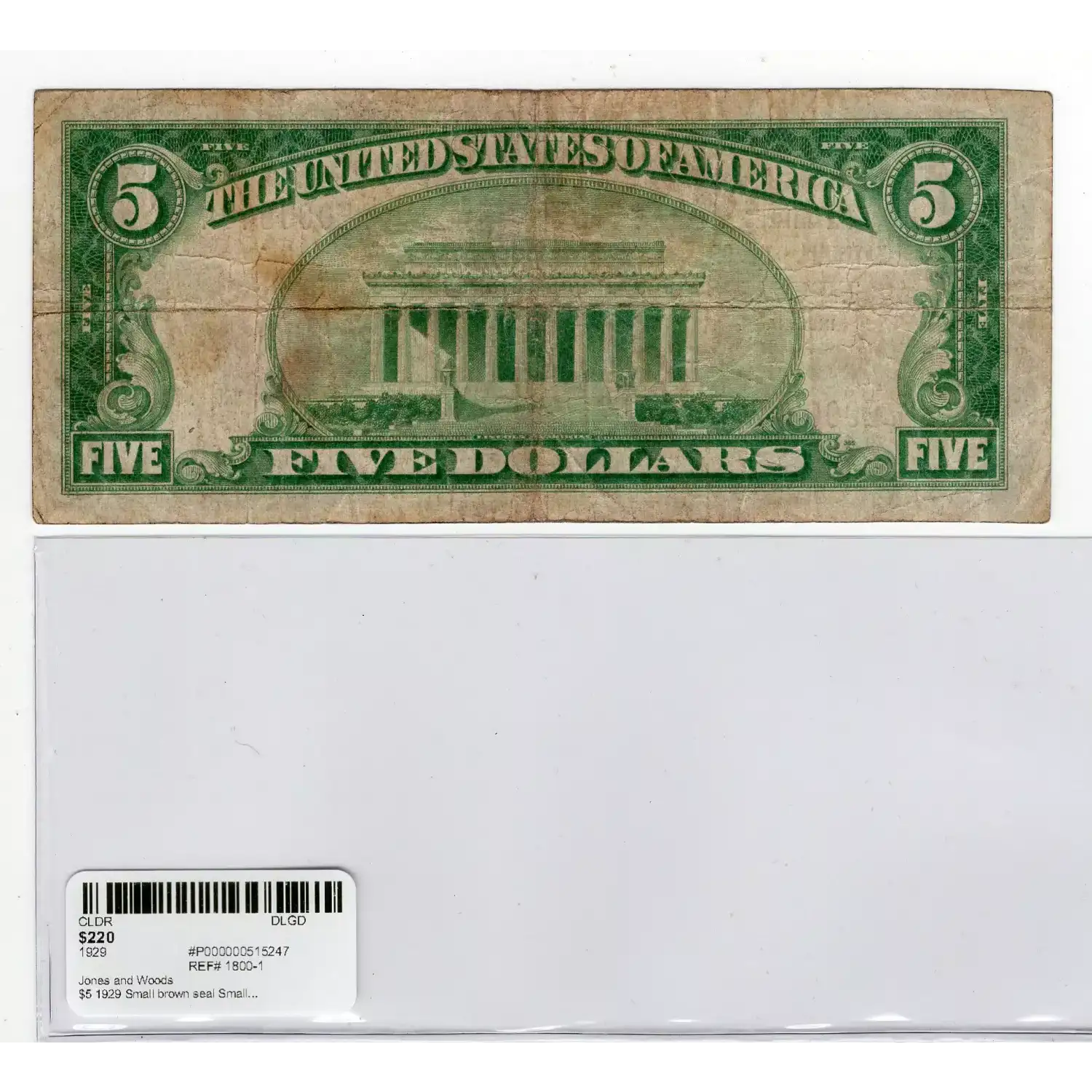 $5 1929 Small brown seal Small National Bank Notes 1800-1
