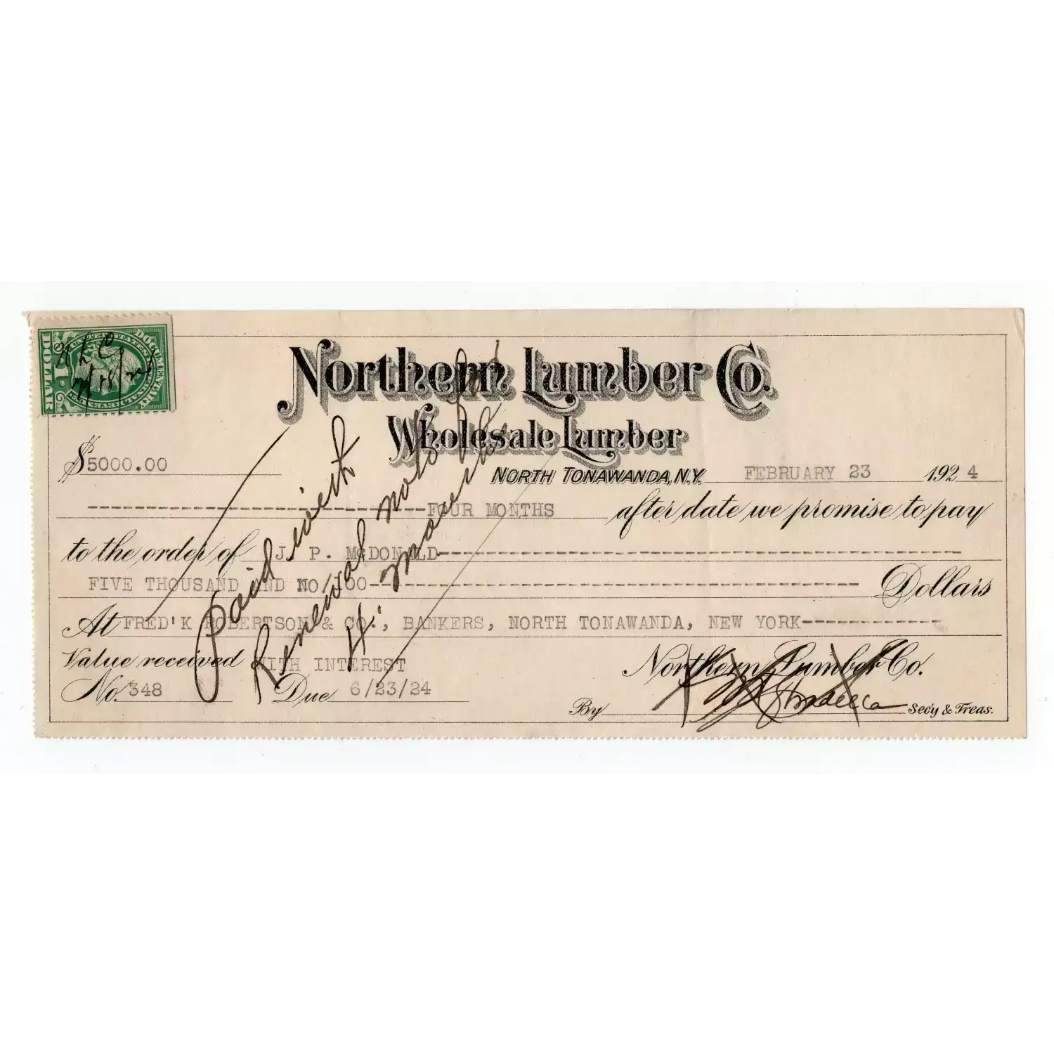 1924 $5,000 North Lumber Co. North Towanda, New York Check with Tax Stamp