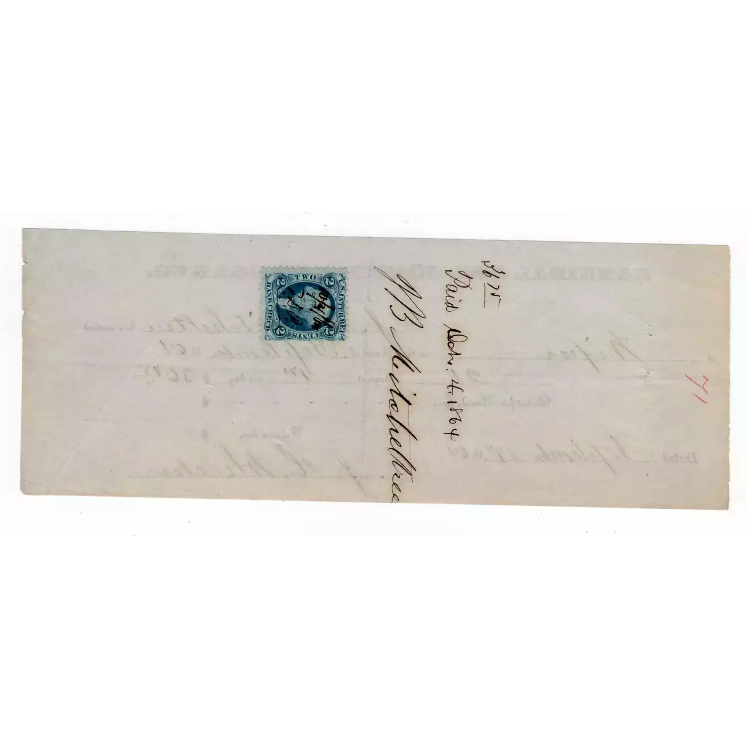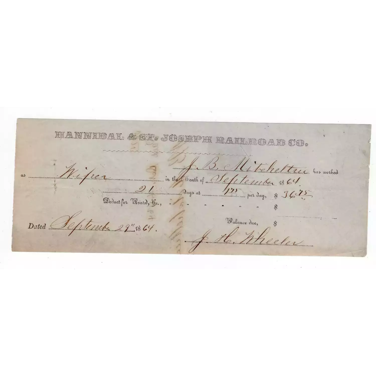 $36.75 1864 Hannibal & St. Joseph Railroad Co. Paycheck Missouri with Tax Stamp