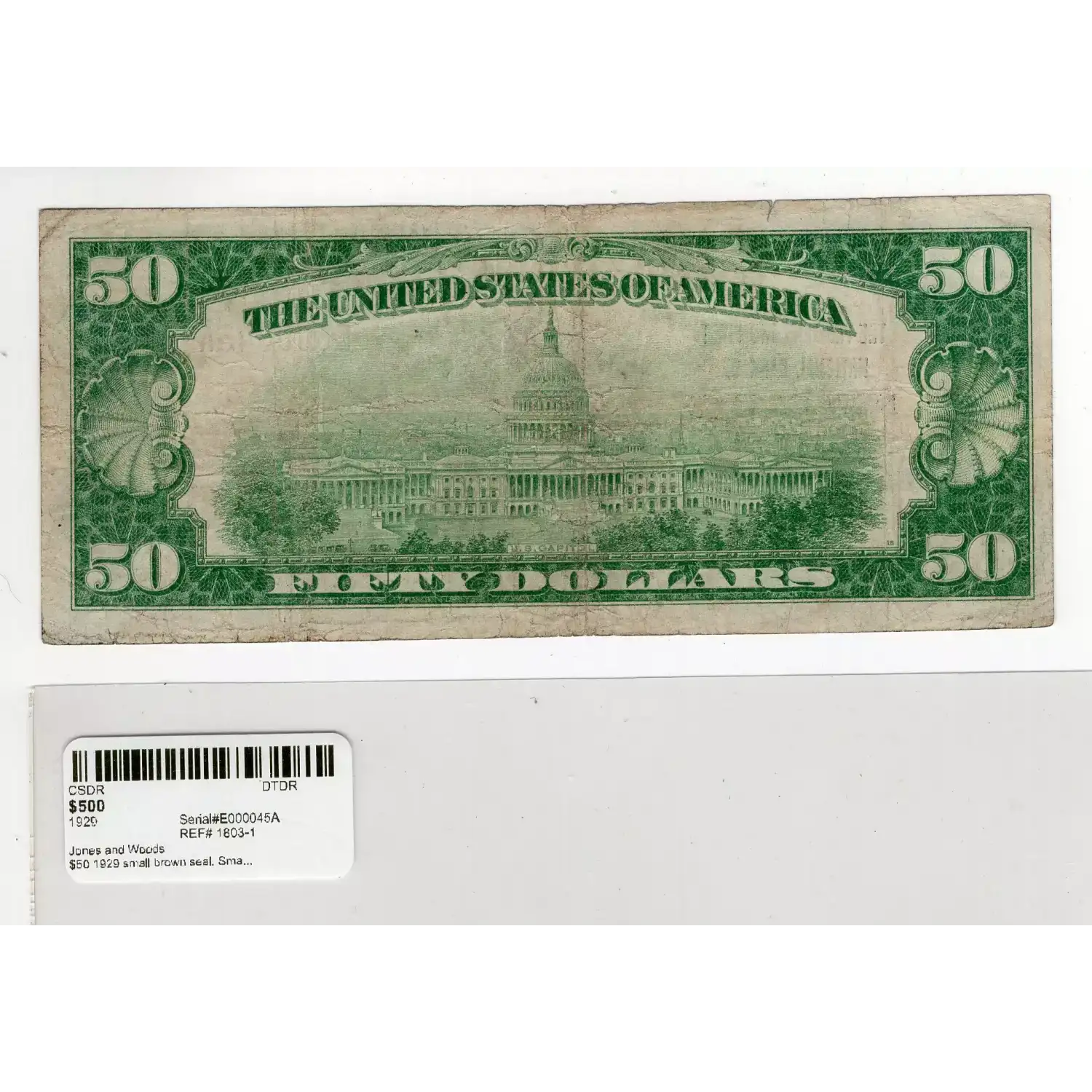 $50 1929 small brown seal. Small National Bank Notes 1803-1