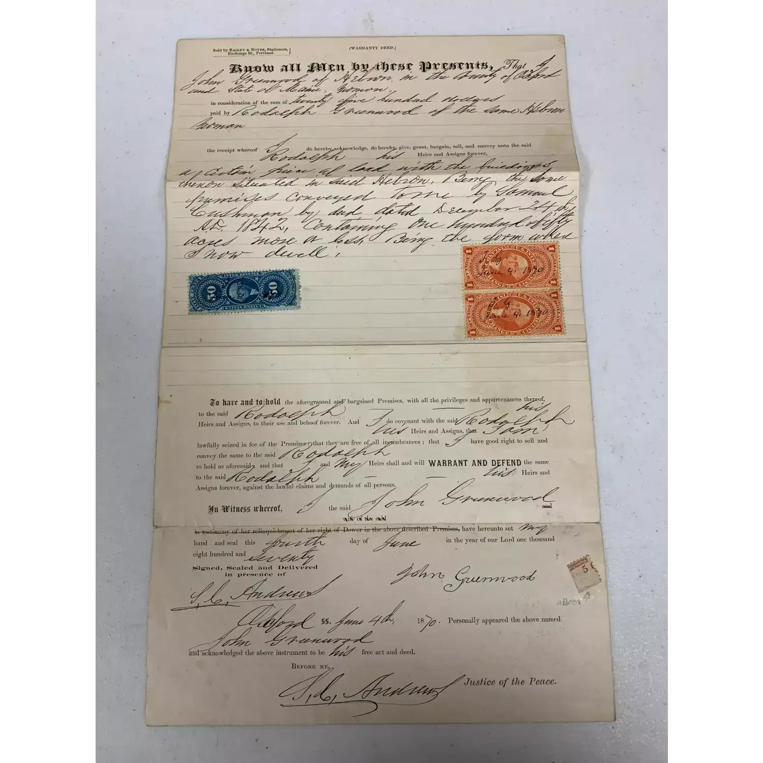 1870 Land Deed Hebron, Maine? with cancelled tax stamps