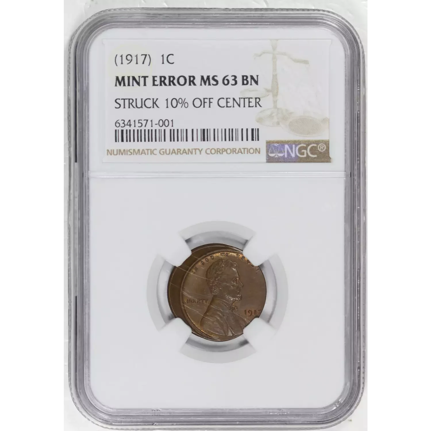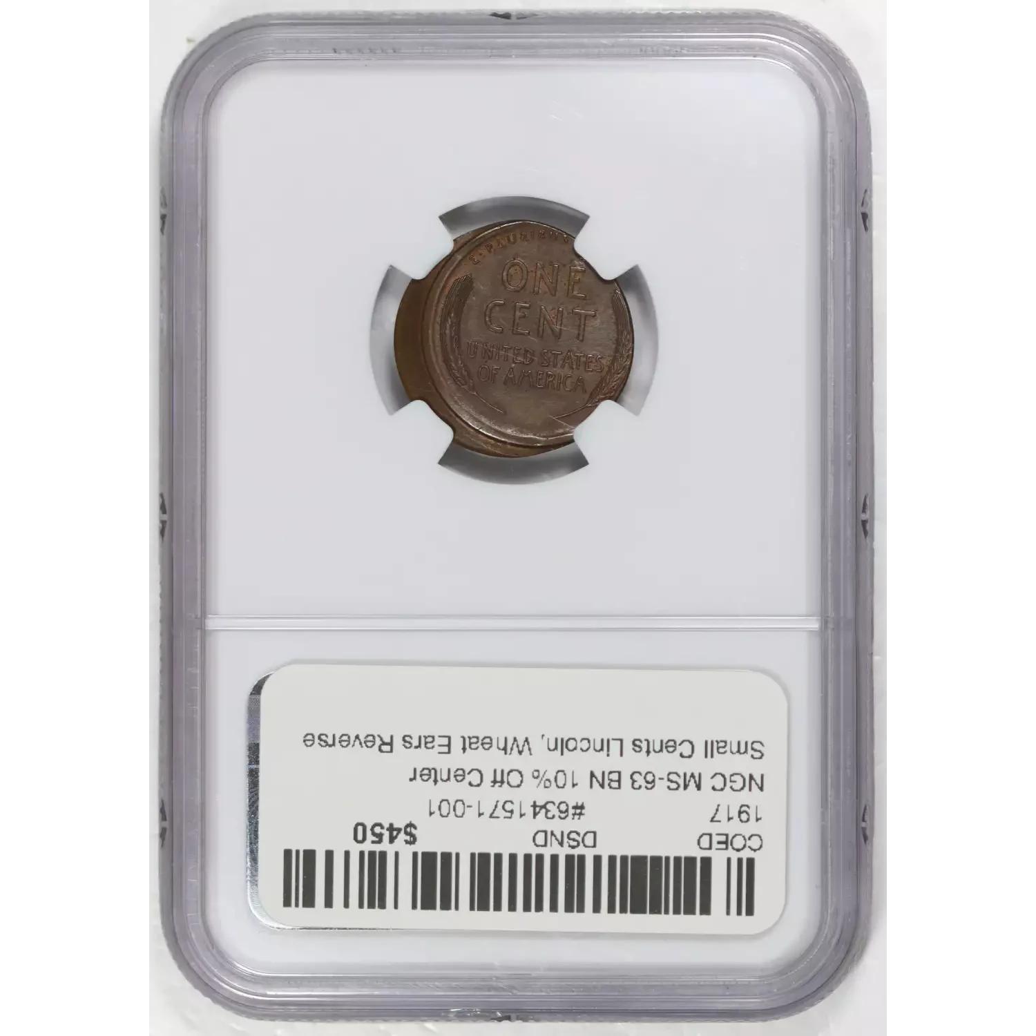 1917 Small Cents Lincoln, Wheat Ears Reverse NGC MS-63 BN 10% Off Center