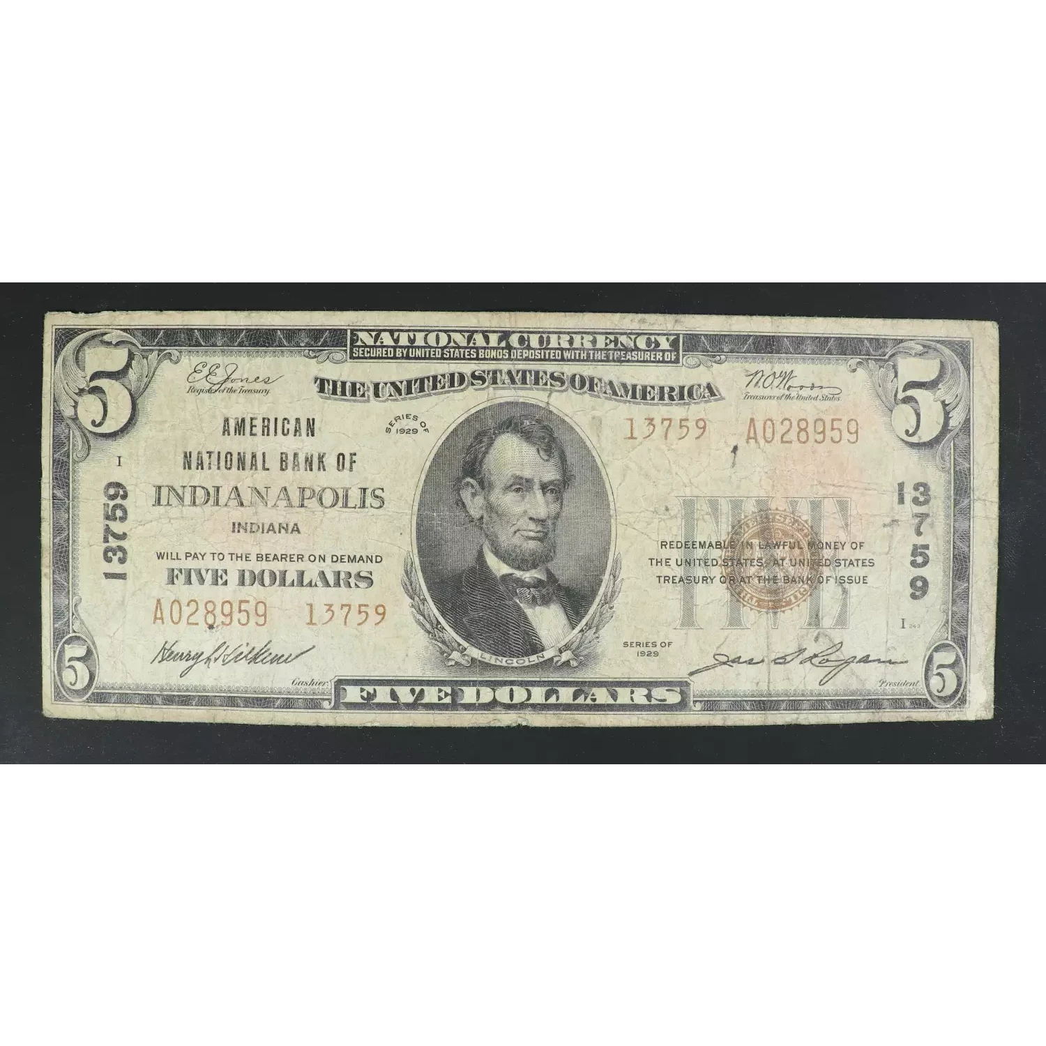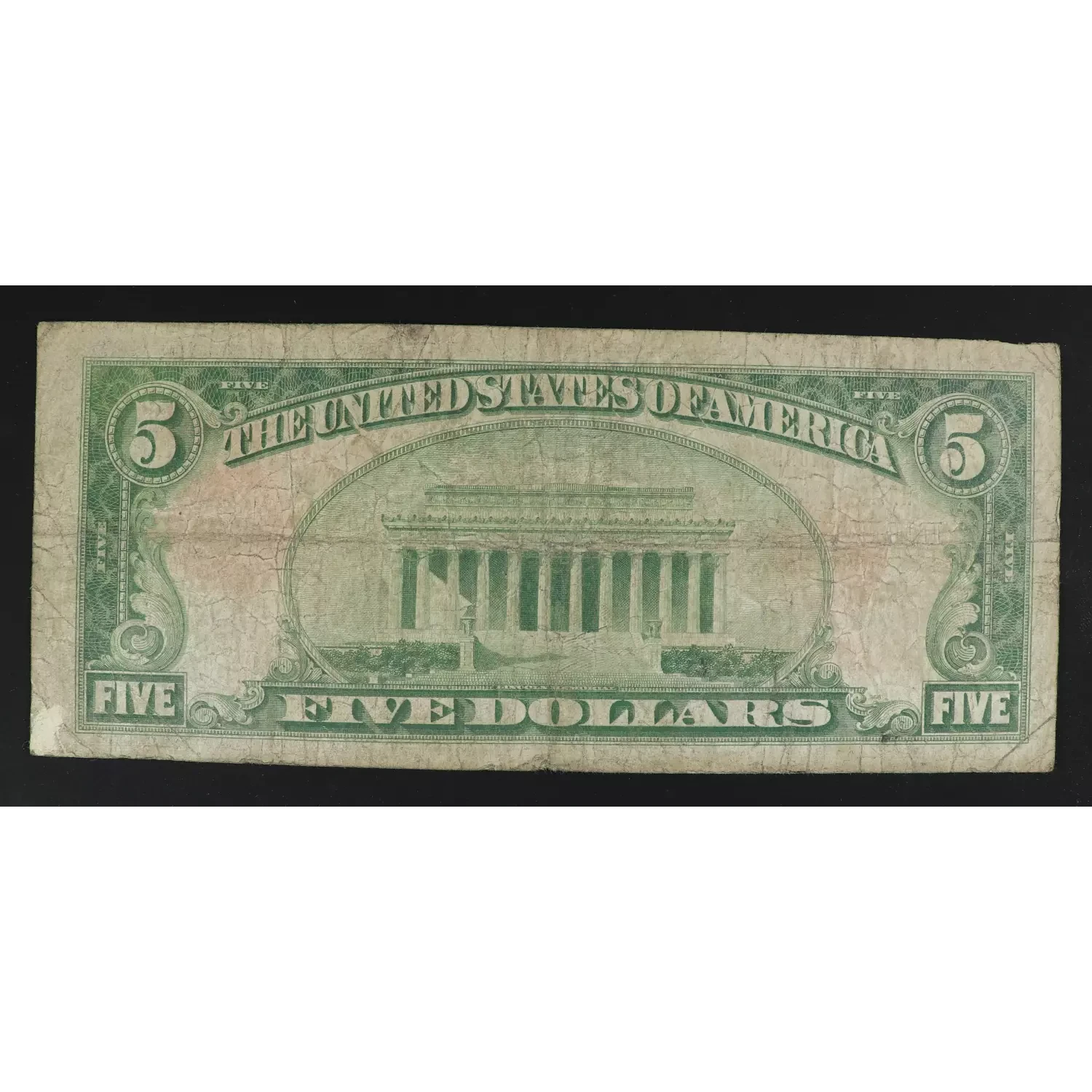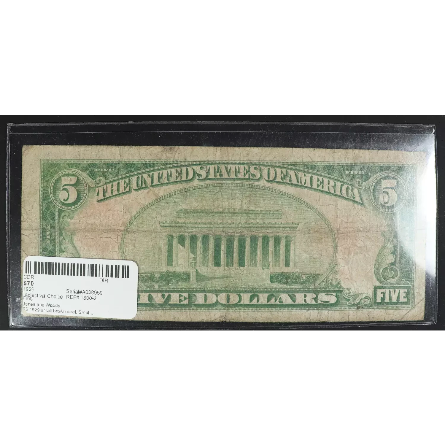 $5 1929 small brown seal. Small National Bank Notes 1800-2