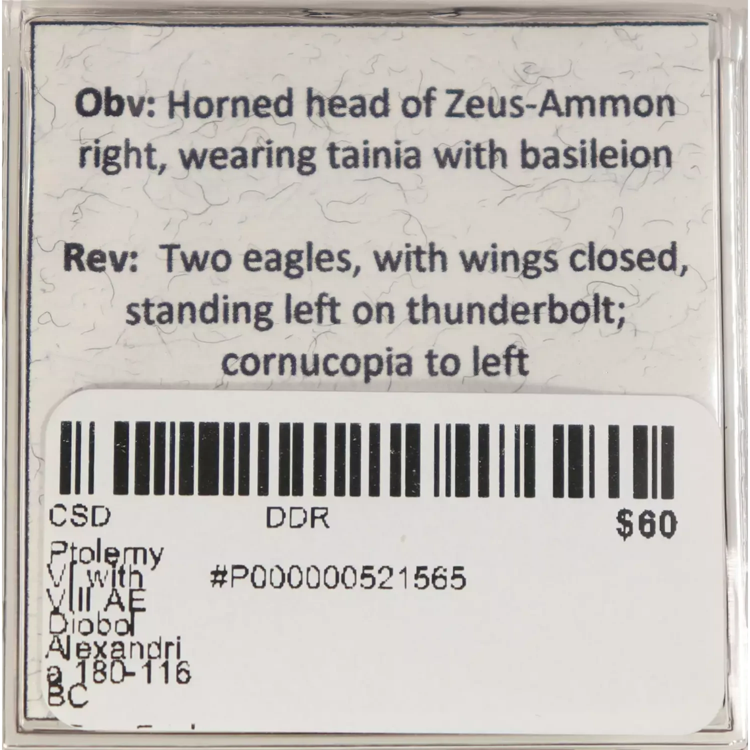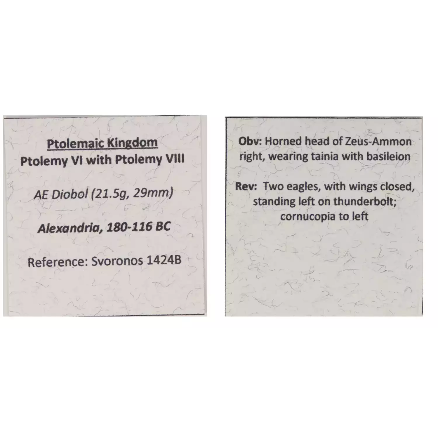 | Year | Ptolemy VI with VIII AE Diobol Alexandria 180-116 BC |