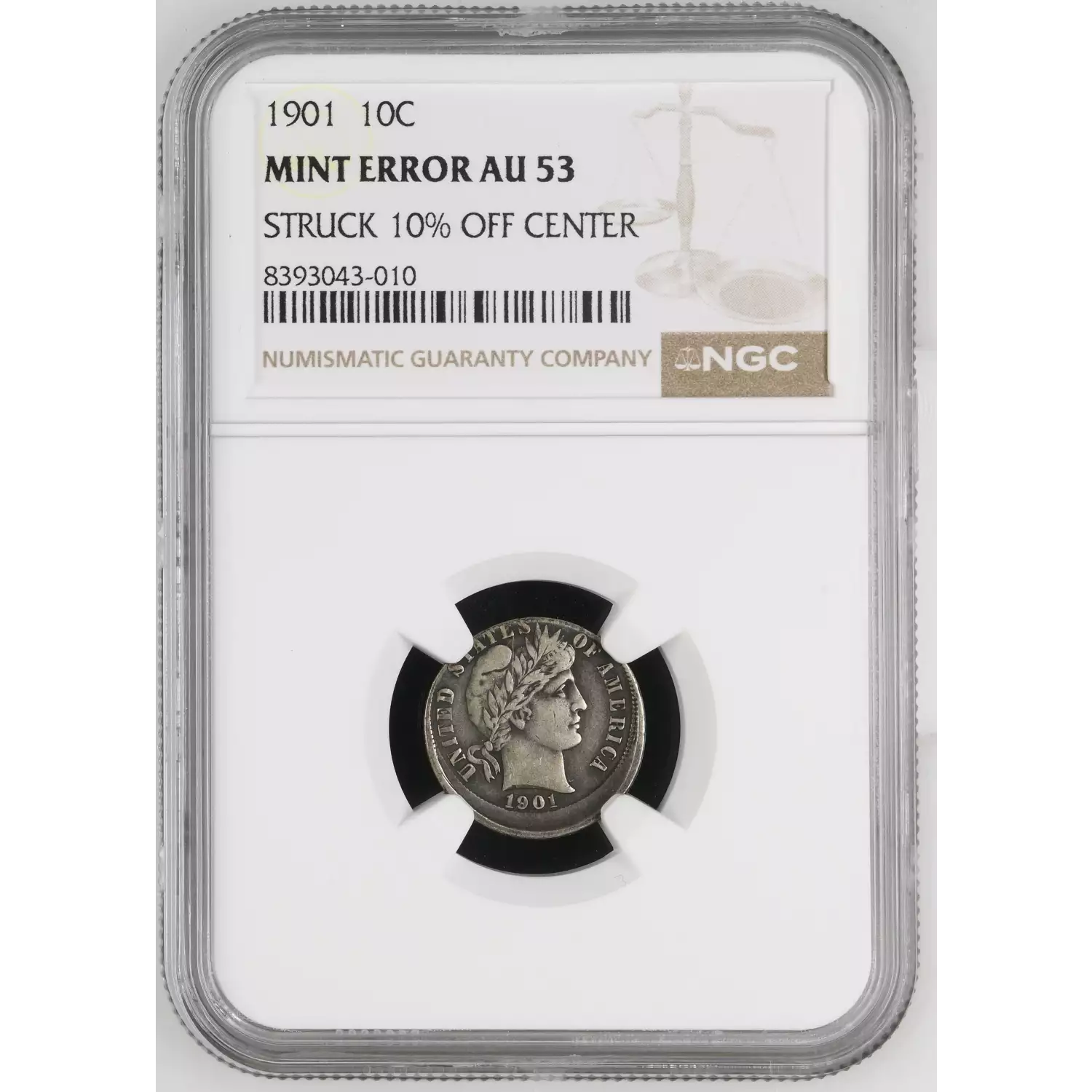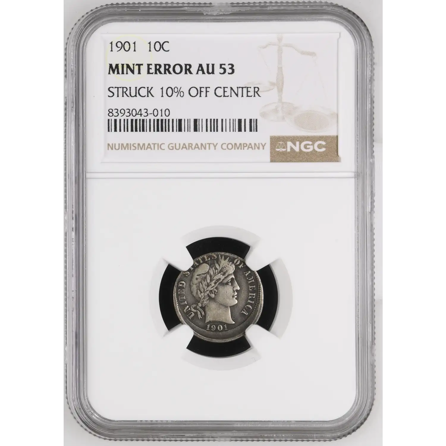 1901 Dimes Barber or Liberty Head NGC AU-53 Struck 10% Off Center