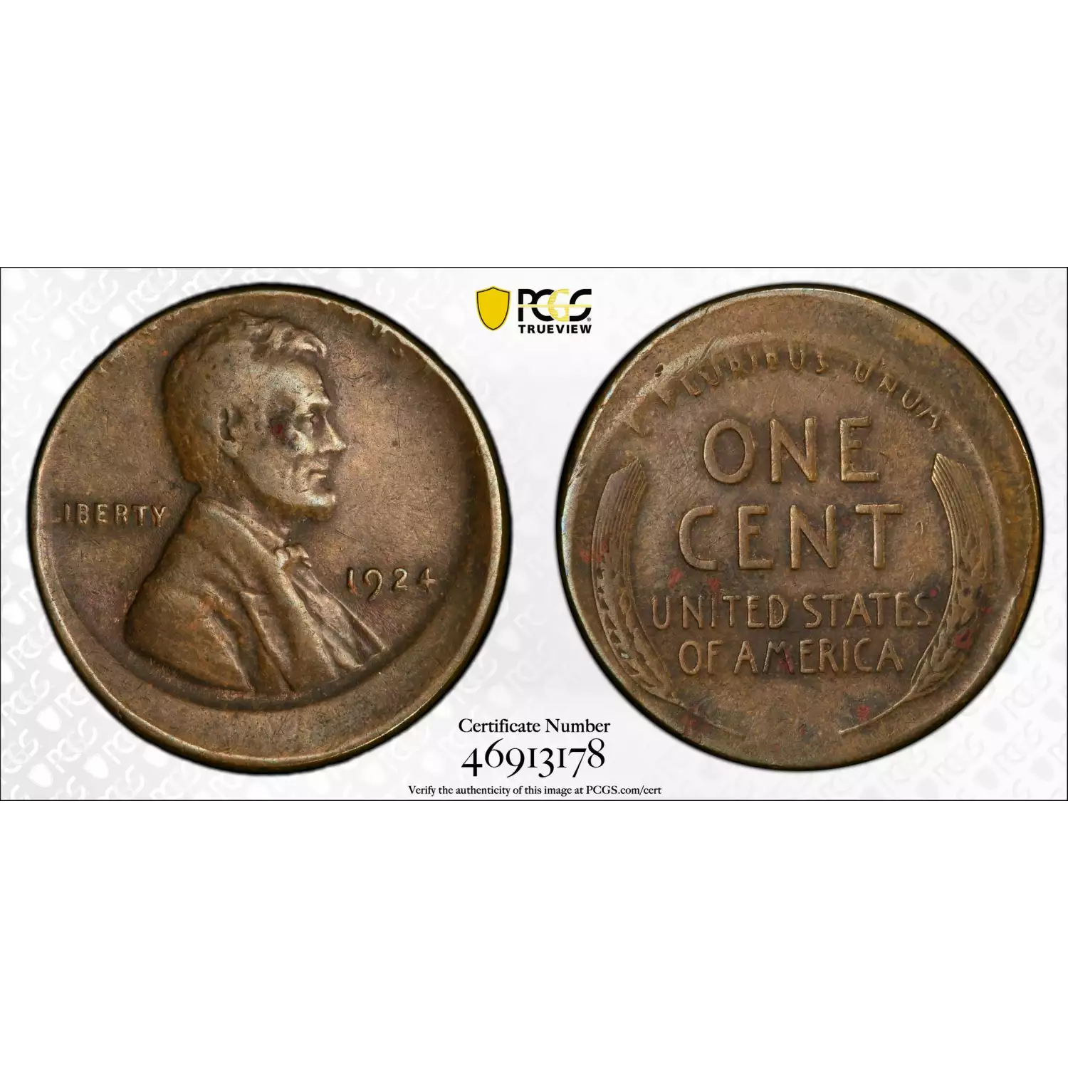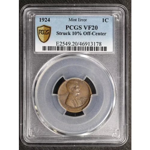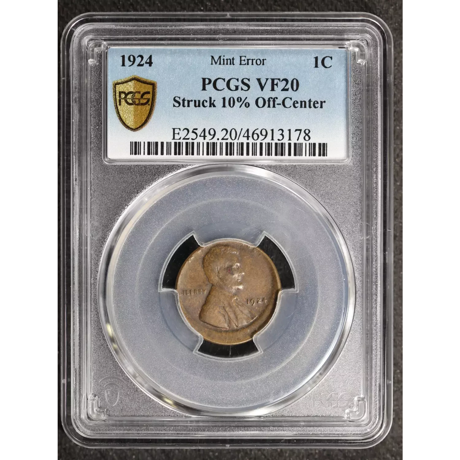 1924 Small Cents Lincoln, Wheat Ears Reverse PCGS VF-20 Struck 10% Off Center BN