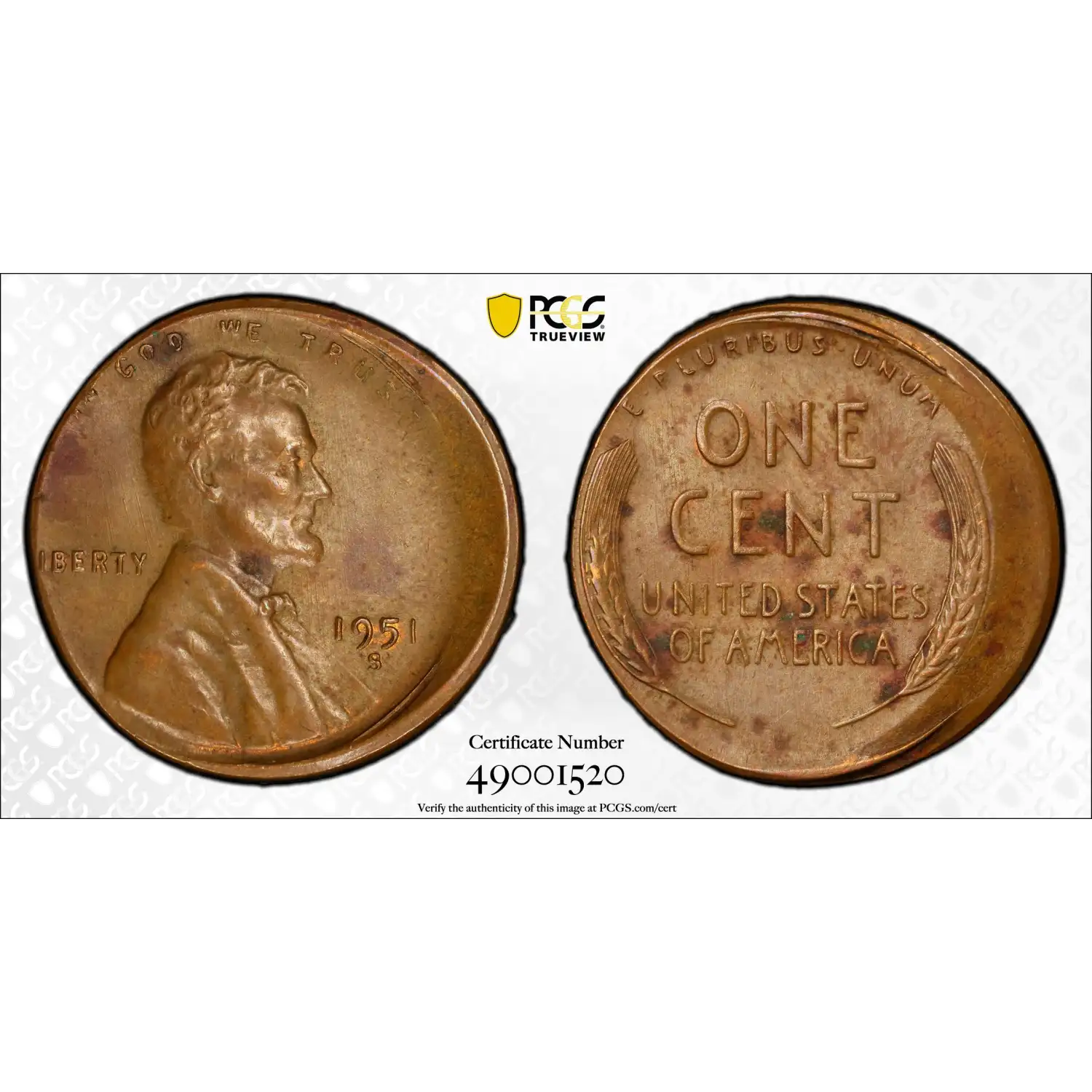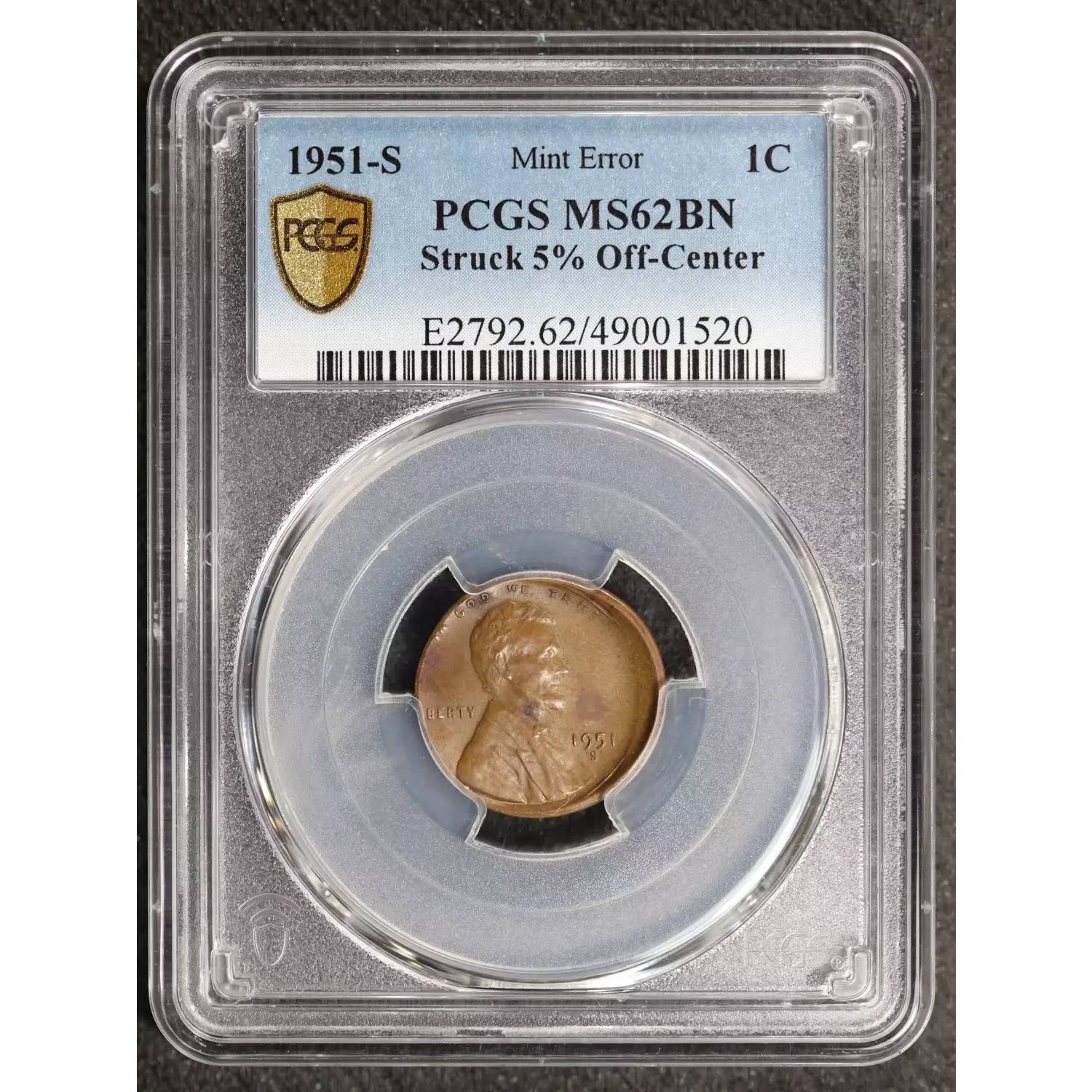 1951-S Small Cents Lincoln, Wheat Ears Reverse PCGS MS-62 Struck 5% Off Center BN