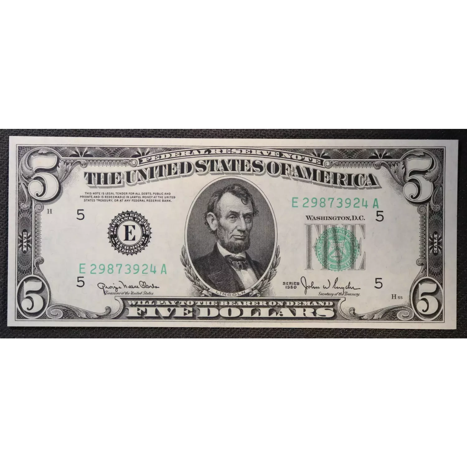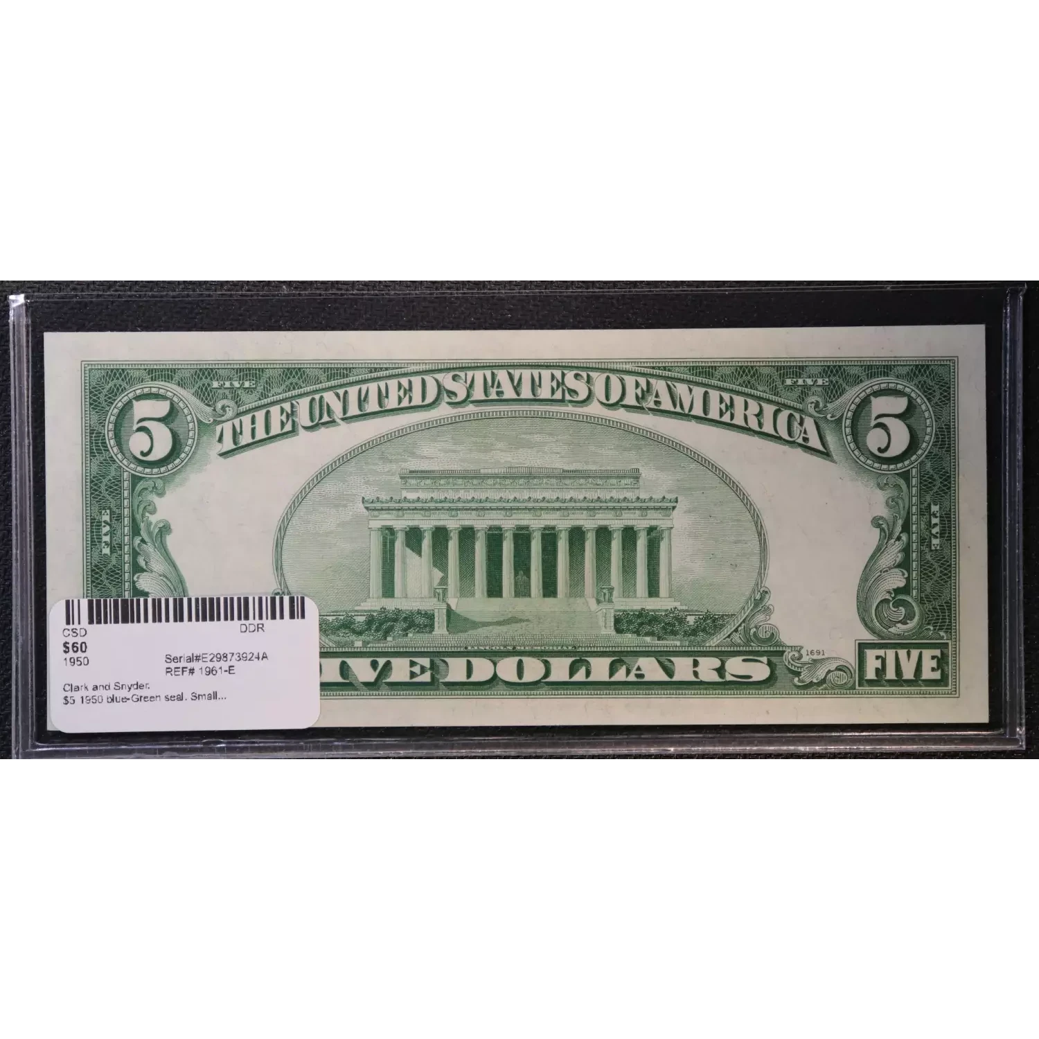 $5 1950 blue-Green seal. Small Size $5 Federal Reserve Notes 1961-E