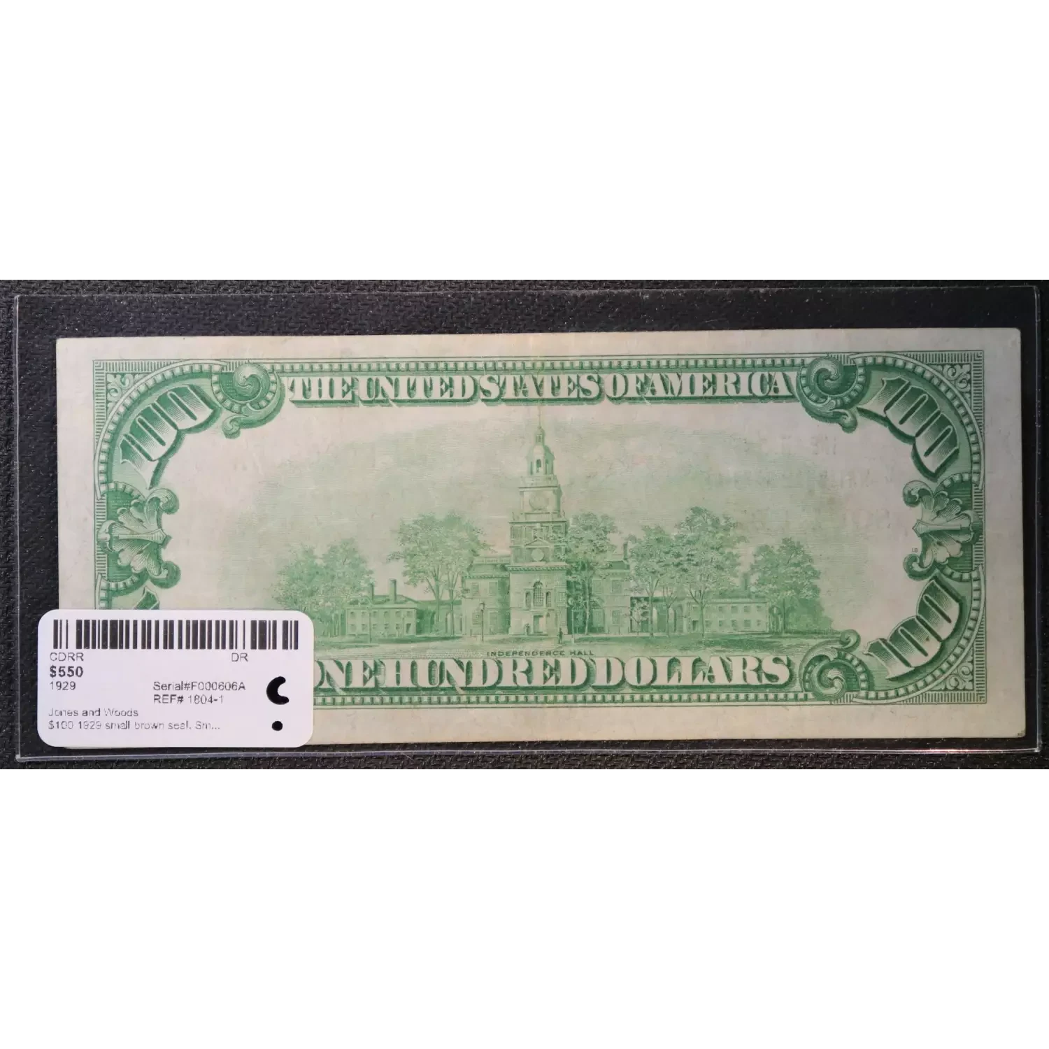 $100 1929 small brown seal. Small National Bank Notes 1804-1