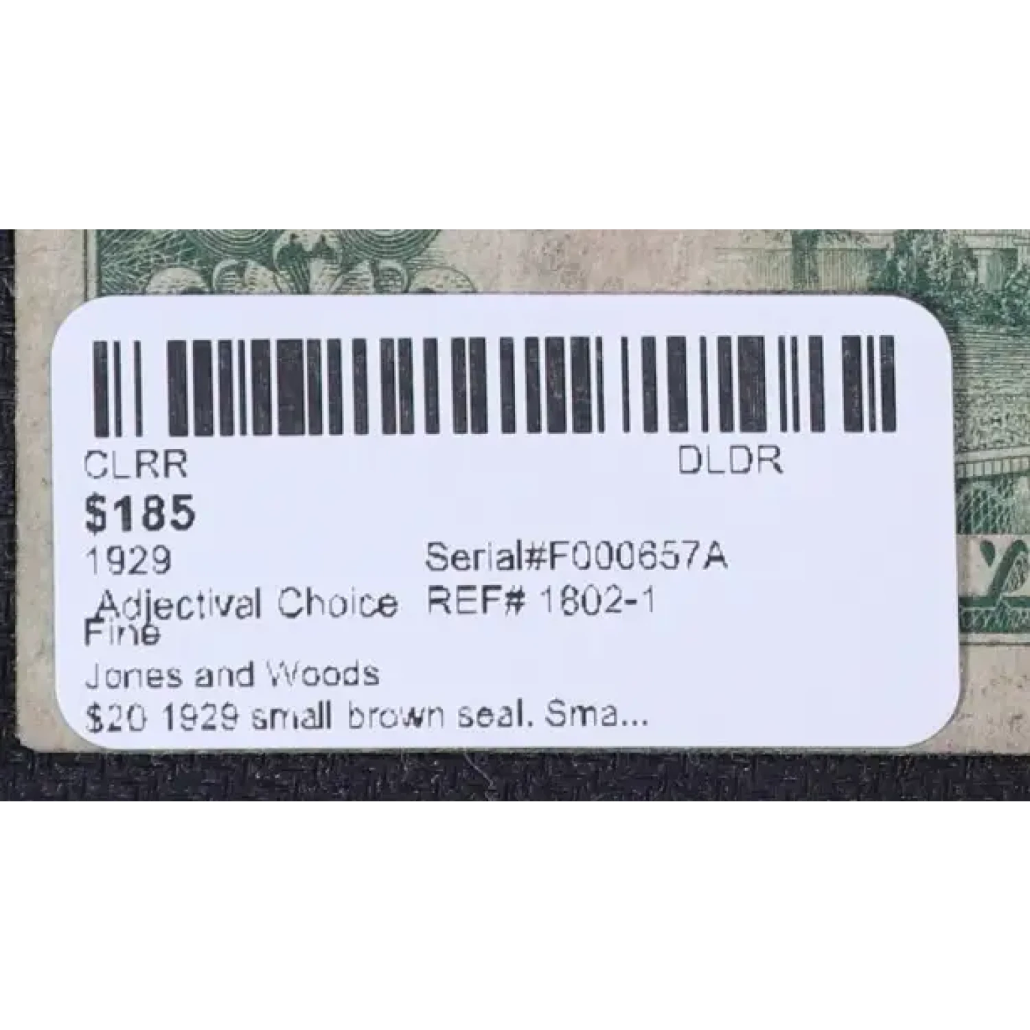 $20 1929 small brown seal. Small National Bank Notes 1802-1