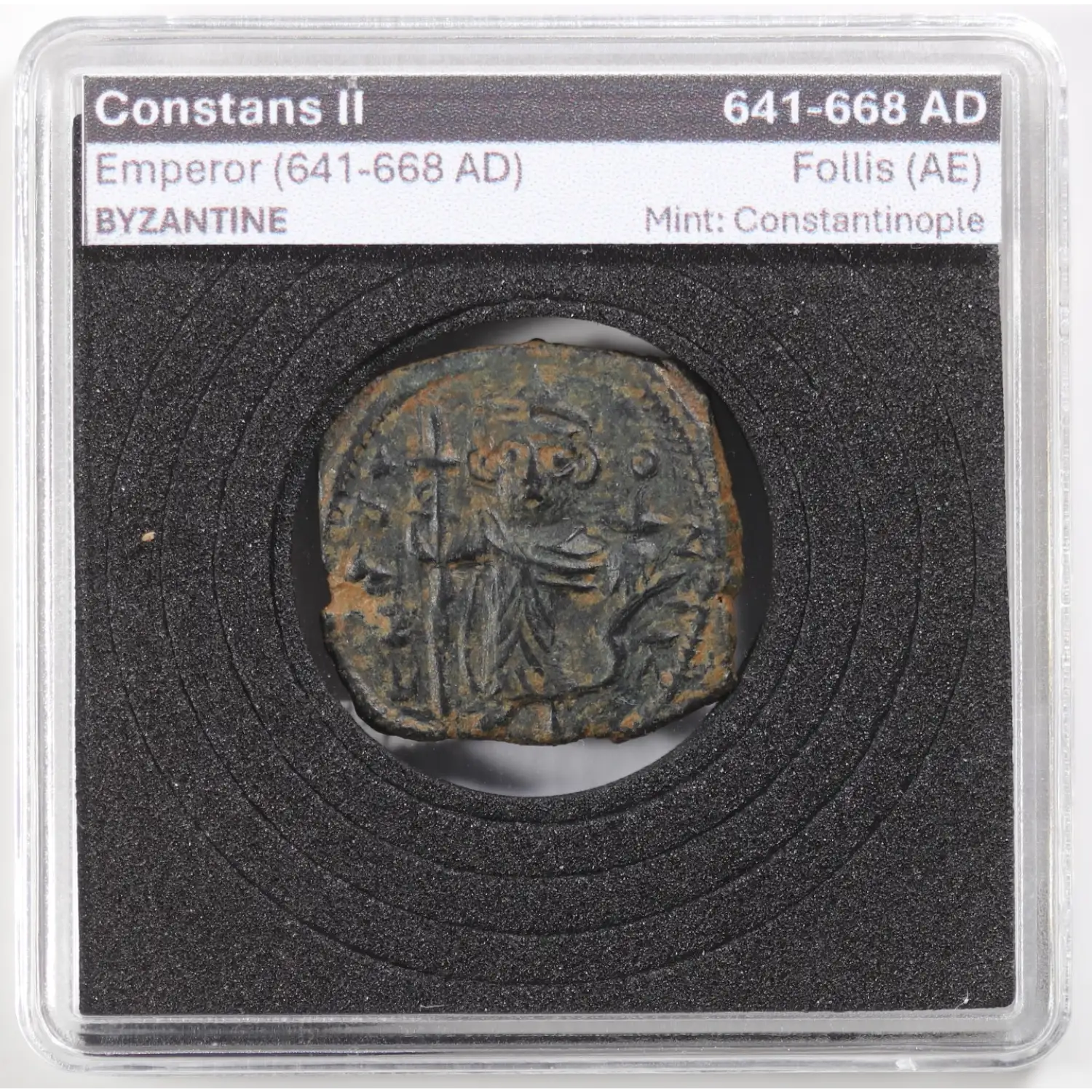 Extremely Nice Byantine Constans II AE Follis Constantinople 641-668 ADCoin is in an unsealed "quadrum" case for display purposes, simply insert a thumbnail into the bottom right corner and pull apartour inventory sticker with the barcode is an easy peel sticker that leaves no mess behind