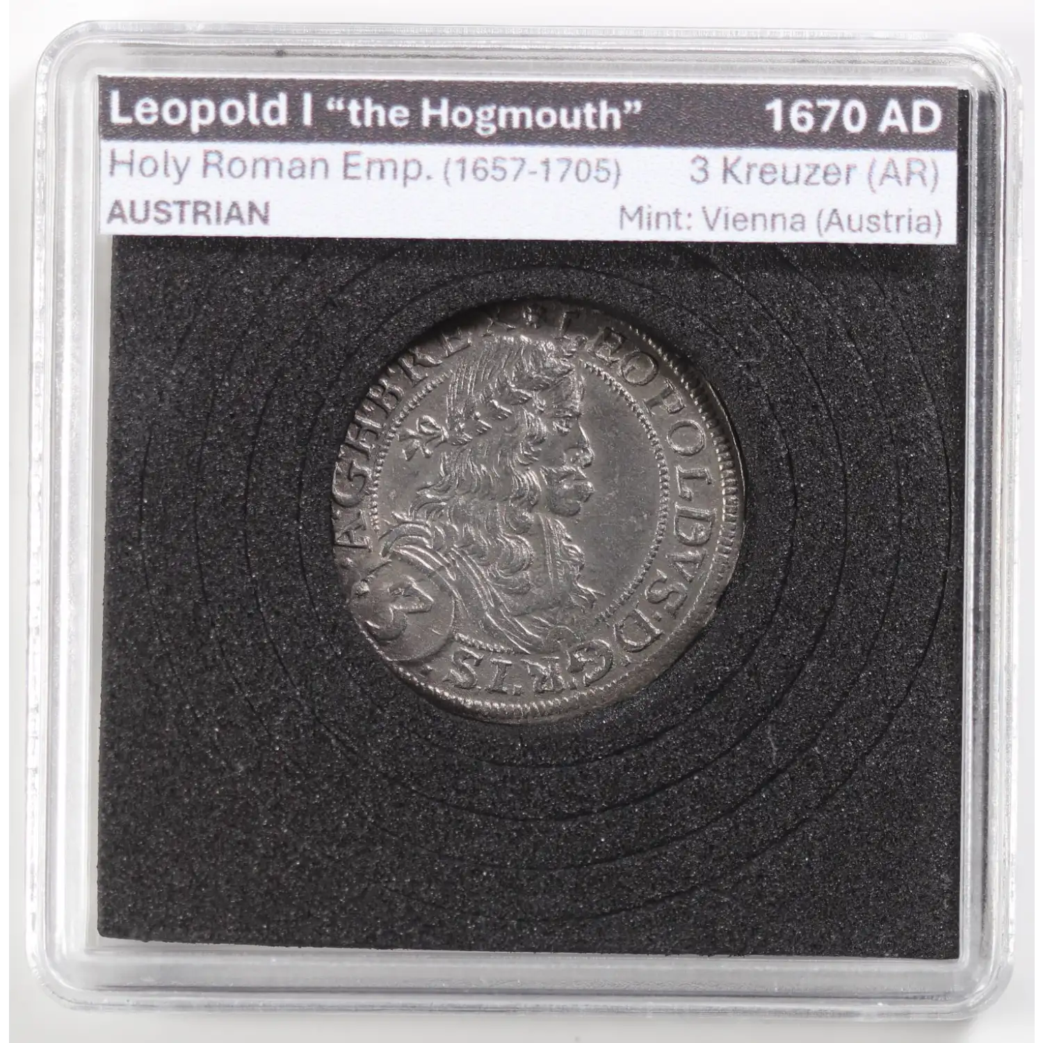 Holy Roman Empire Leopold I 'hogmouth' 3 Kreuzer 1670Coin is in an unsealed "quadrum" case for display purposes, simply insert a thumbnail into the bottom right corner and pull apartour inventory sticker with the barcode is an easy peel sticker that leaves no mess behind