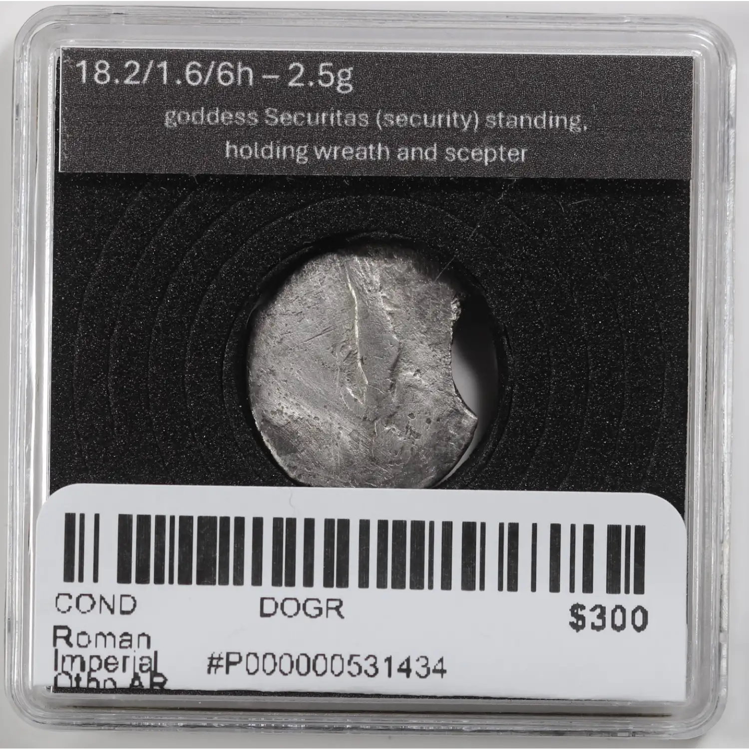 Roman Imperial Otho AR Denarius (chipped) 69 AD Securitas rev.Coin is in an unsealed "quadrum" case for display purposes, simply insert a thumbnail into the bottom right corner and pull apartour inventory sticker with the barcode is an easy peel sticker that leaves no mess behind