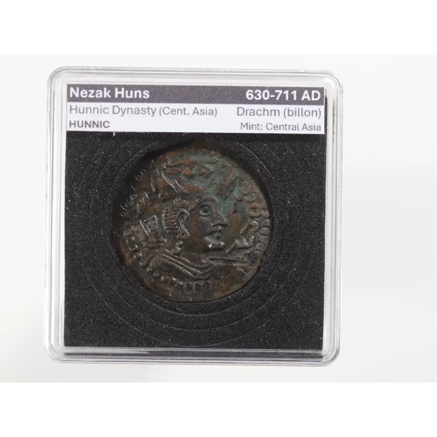 Central Asia Hunnic Tribes Nezak Huns BI Drachm 630-711 AD King/Fire AltarCoin is in an unsealed "quadrum" case for display purposes, simply insert a thumbnail into the recessed corner and pull apartour inventory sticker with the barcode is an easy peel sticker that leaves no mess behind