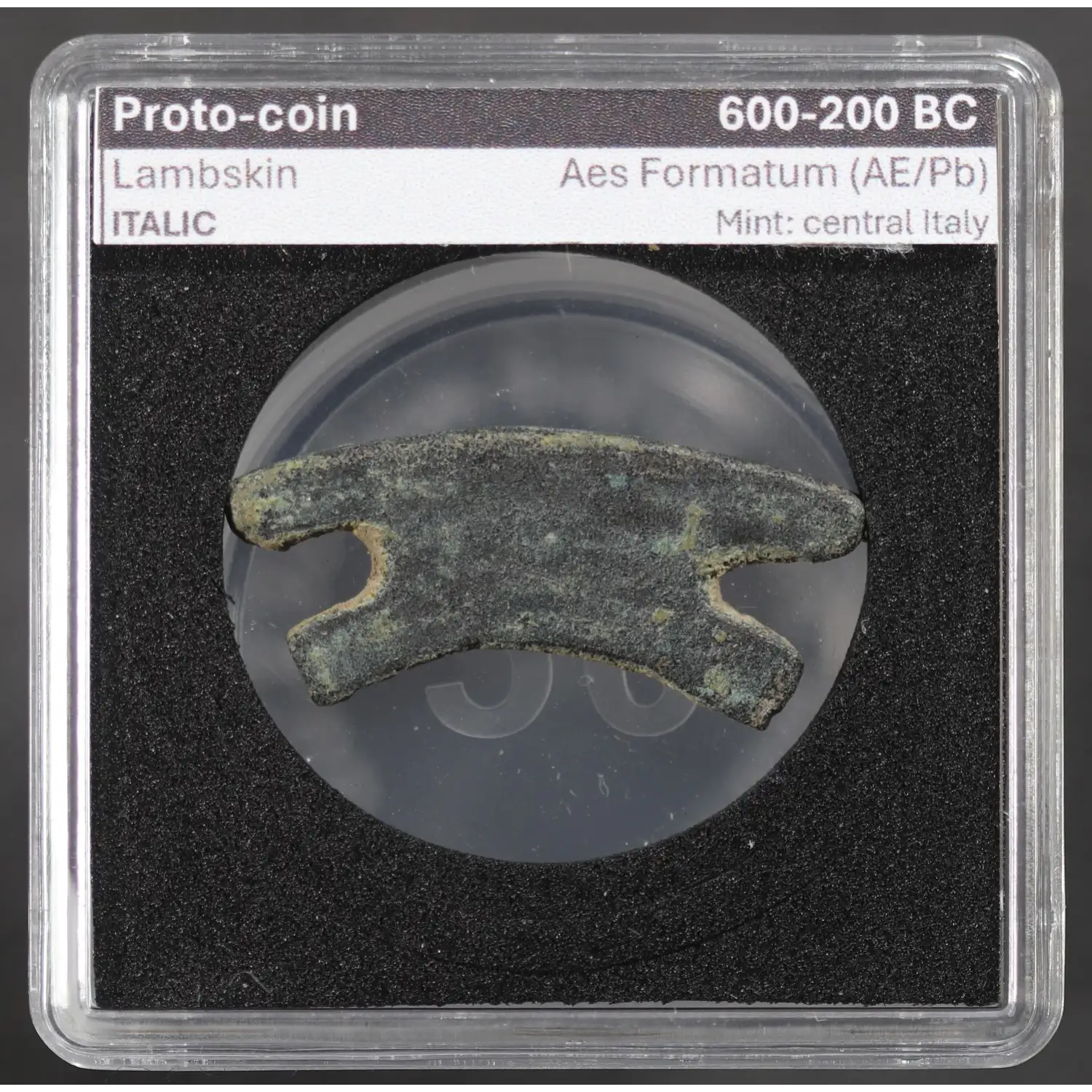Ancient Central Italy AES Formatum Protocoin 600-200 BC Lambskin shapeWeight: 4.9gCoin is in an unsealed "quadrum" case for display purposes, simply insert a thumbnail into the bottom right corner and pull apartour inventory sticker with the barcode is an easy peel sticker that leaves no mess behind