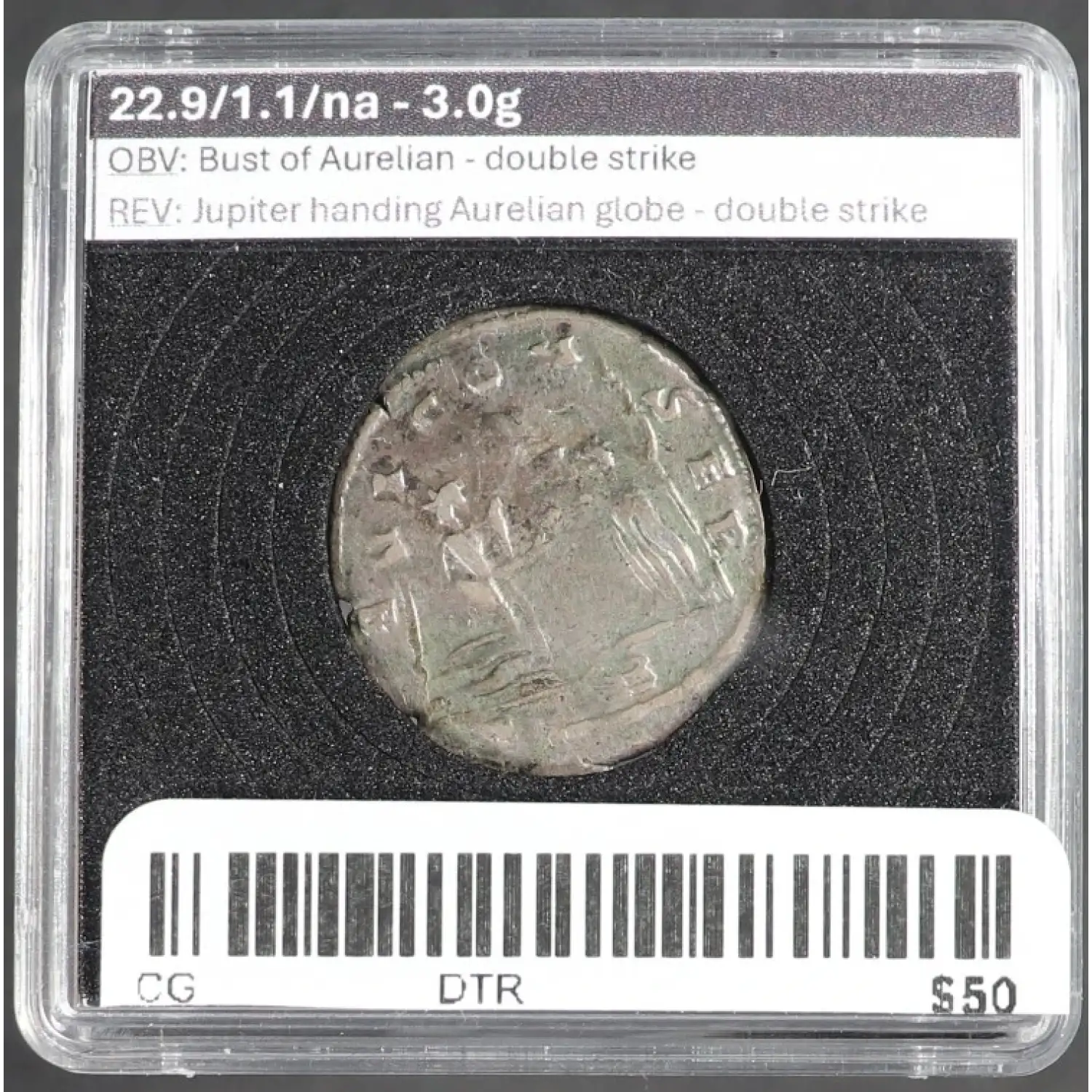 Aurelian Antoninianus Double Struck 270-275 AD Jupiter & Aurelian rev.Coin is in an unsealed "quadrum" holder for display purposes, insert a thumbnail in bottom left corner to pull apart