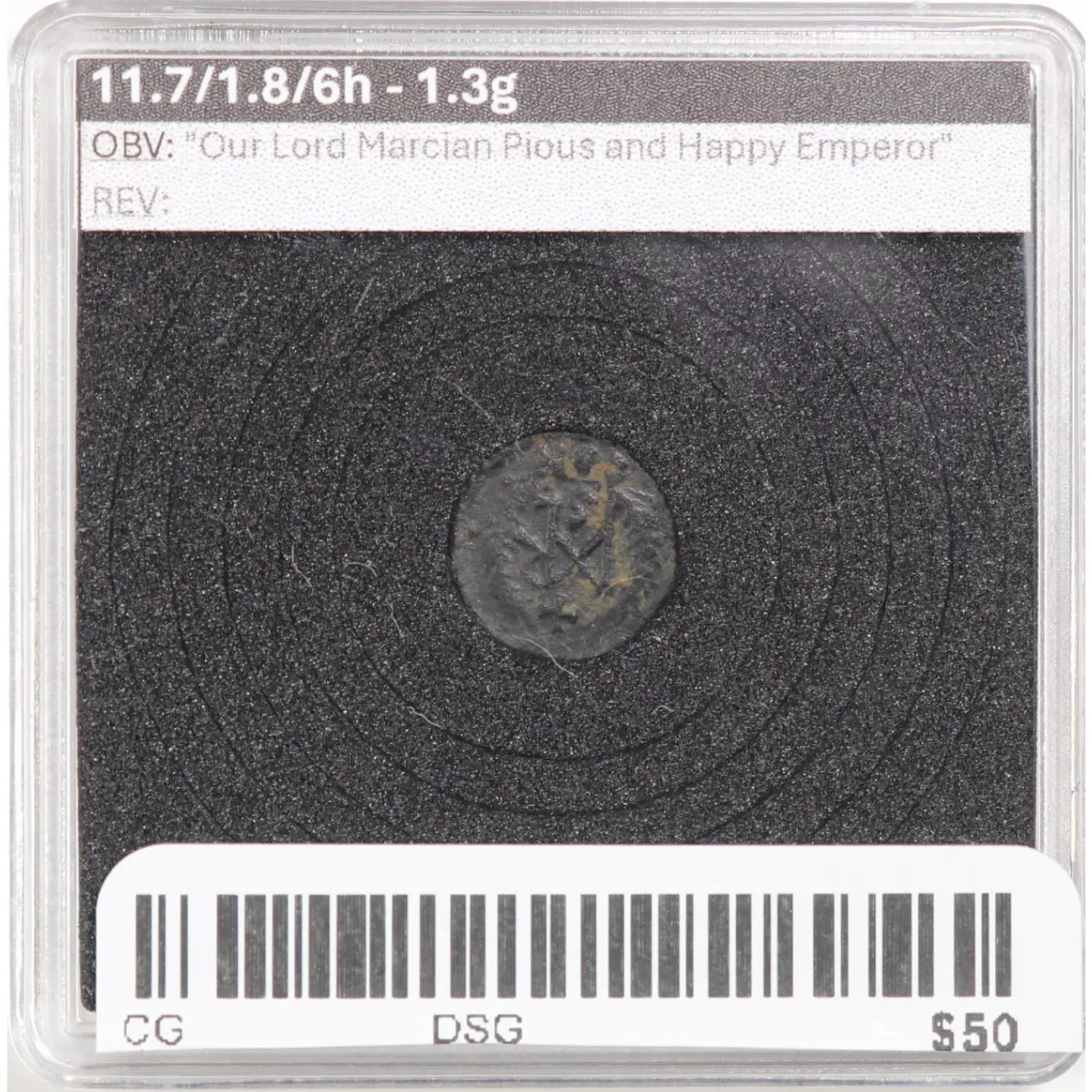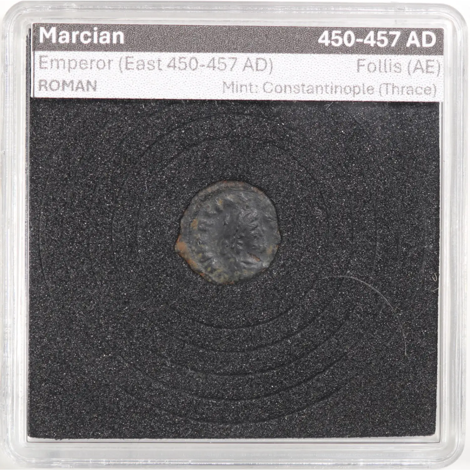 Marcian AE Small Follis Constantinople mint 450-457 AD Monogram reverseCoin is in an unsealed "quadrum" holder for display purposes, insert a thumbnail in bottom right corner to pull apart